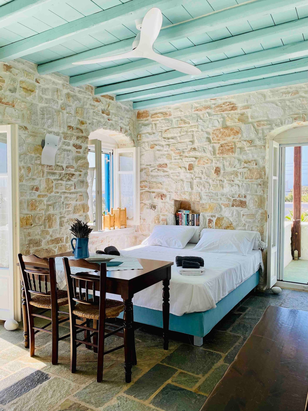 石で飾られた伝統的な装飾のワンルームアパートメント(35平方メートル)。2つの大きな専用テラス、海の眺め、ナクソス島の眺めが楽しめます。 パロス島の最高のエリアにあります。 ヴィラはサンタマリアビーチから300mのところにあり、私たちのワンルームは1階にあります。 私たちのワンルームアパートは3名様まで宿泊可能で、カップルに最適です。