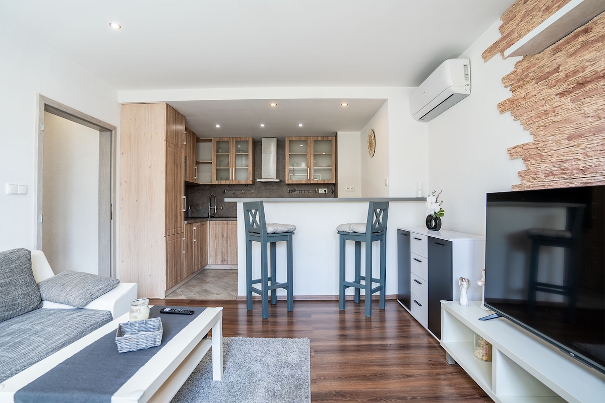 Tento apartmán je kombinací skvělé lokality, luxusního vybavení a pohodlí. Pokud potřebujete místo na práci, máte zde komfort jako v kanceláři. Pokud chcete odpočívat, je vám k dispozici pohodlná kožená sedačka s velkou TV a placenými programy nebo kvalitní manželská postel. Můžete si zde pohodlně uvařit v moderní kuchyni a posedět u jídelního stolu. K tomu elegantní koupelna, prostorná šatna, terasa a vlastní parkování hned u domu zdarma a bez stresu. V blízkosti je krásný les s cyklostezkami.