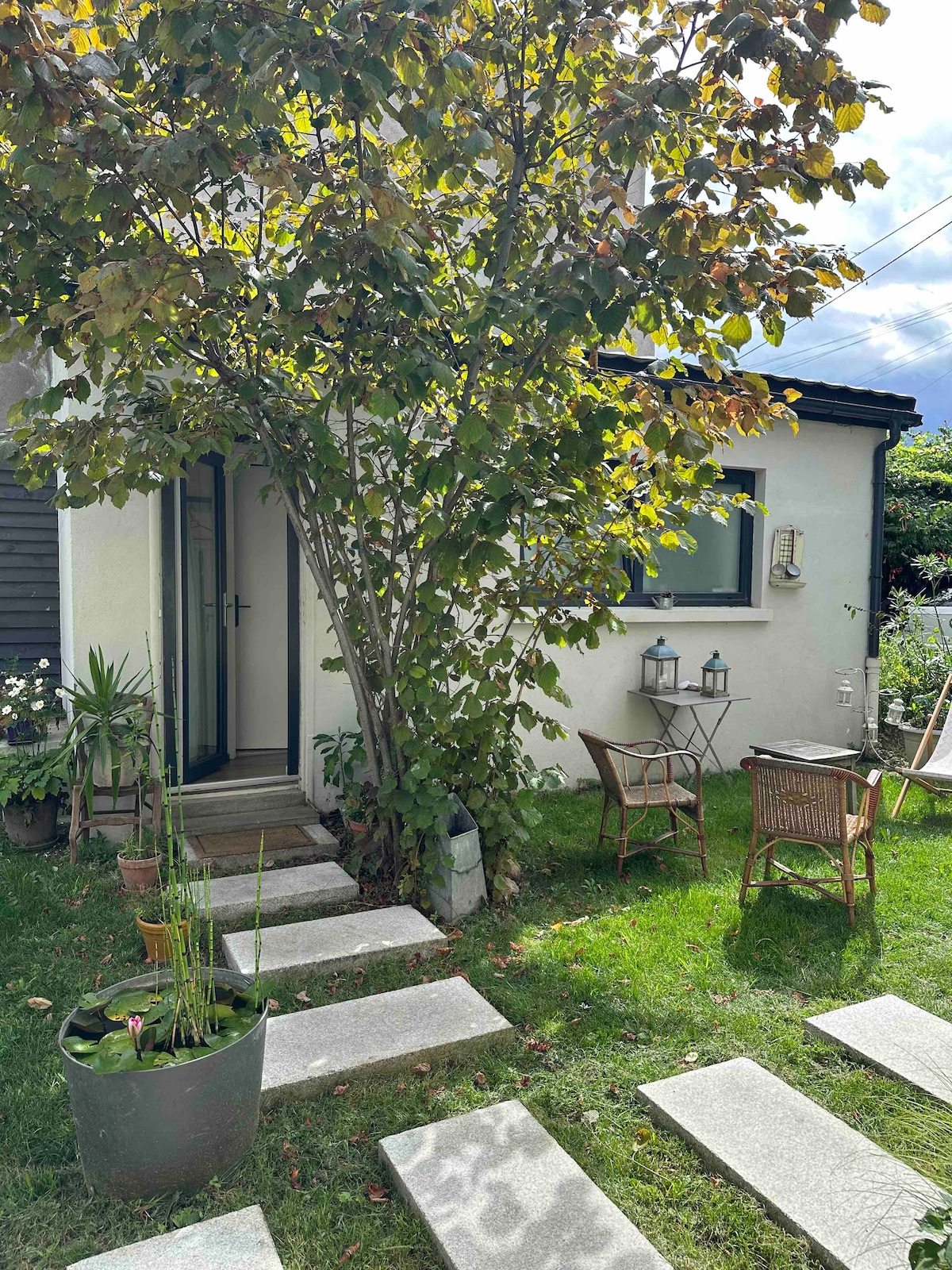 パリ中心部から15分の田舎の家のような魅力に満ちた30平方メートルのタイニーハウス。 静かな庭の奥にあり、RER B線バニュー駅や商店街(スーパー、パン屋)まで徒歩3分です。 リフォーム済みで、快適なダブルサイズのソファーベッド1台、キッチン兼ダイニングエリア、オフィススペース、シャワー付きバスルーム、お庭に面した専用エリアがあります。 シーツとタオルは用意されています。 小さなプラス:居心地の🔥良い夜のための薪ストーブ。 共用庭園へのアクセス。