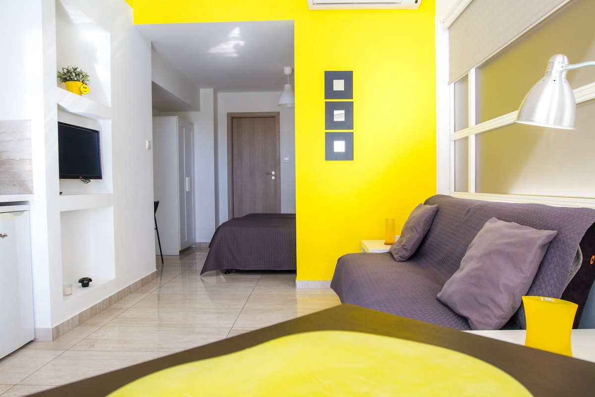 Self-catering studio apartment with modern decoration. Fully equipped kitchen, sofa bed, TV, Wi-Fi and microwave. Shared laundry facility. Great location in the city center, 2-3 minutes walk from the Ayia Napa Monastery and 7 minutes walk to the nearest beach (Pantachou Beach).