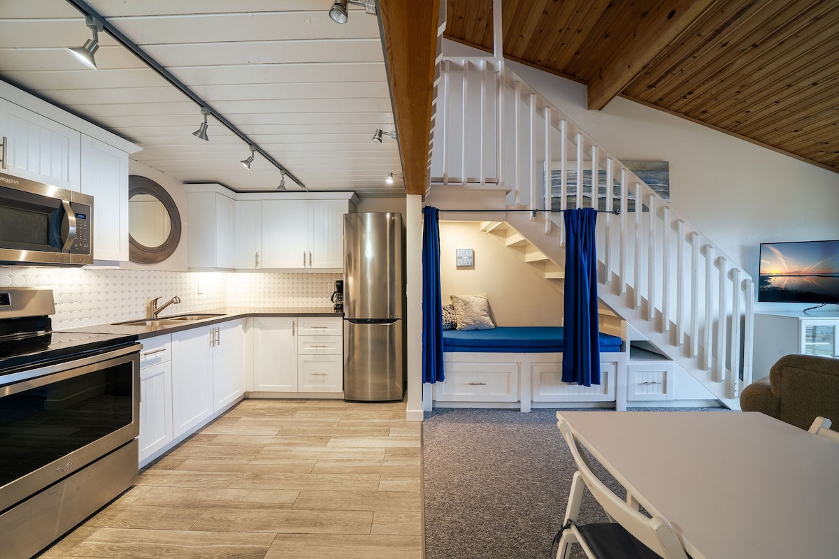 1階のパティオドアから出ると、すぐビーチに到着します。 5月~9月のご滞在中、カヤックを2台無料でご利用いただけます。大人用ライフジャケットが2着あります。 このワンルームマンションには、高品質の家具、フルキッチン、そしてこのエリアでは数多くのアメニティ・設備が備わっています! バスルームの床暖房、ガス暖炉、新しいスマートテレビ、小型家電が多数揃っています。また、お部屋内に洗濯・乾燥機も備わっています。 オーガニックマットレスを備えたクイーンサイズベッド1台と、1名様がお休みいただける引き出せるタイプのツインサイズベッド1台。 インテリアは芸術からインスピレーションを得ています。 中も外も美しさに満ちています。