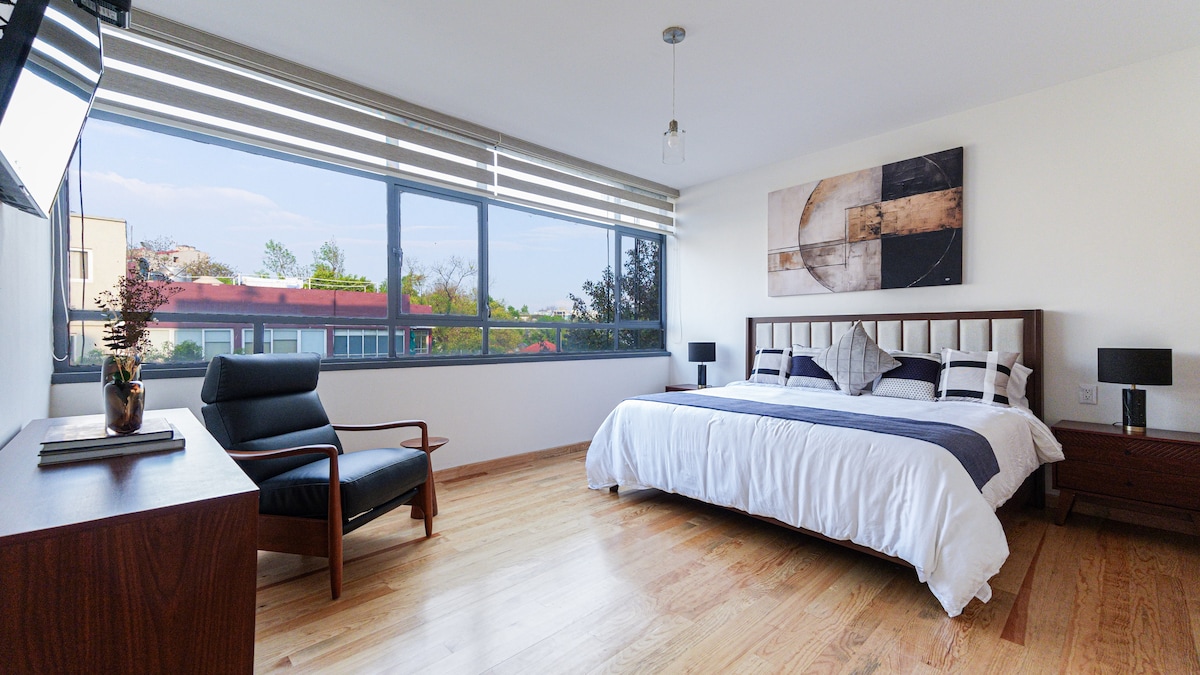 ポランコの中心部にあるミニマリストな都会的なアパートです。 中に入ると、快適な雰囲気に浸ることができます。平和な寝室は、広々とした天井、豪華な寝具付きのキングサイズベッド、完全なバスルームが特徴です。 追加のハーフバスルーム、広々としたリビングとダイニングルーム、設備の整ったオープンキッチンがあります。 お部屋全体に自然光と風通しがあります。 メキシコシティで最も高級なエリア、ポランコの安全で落ち着いた通りにあり、ロケーションは最高です。
