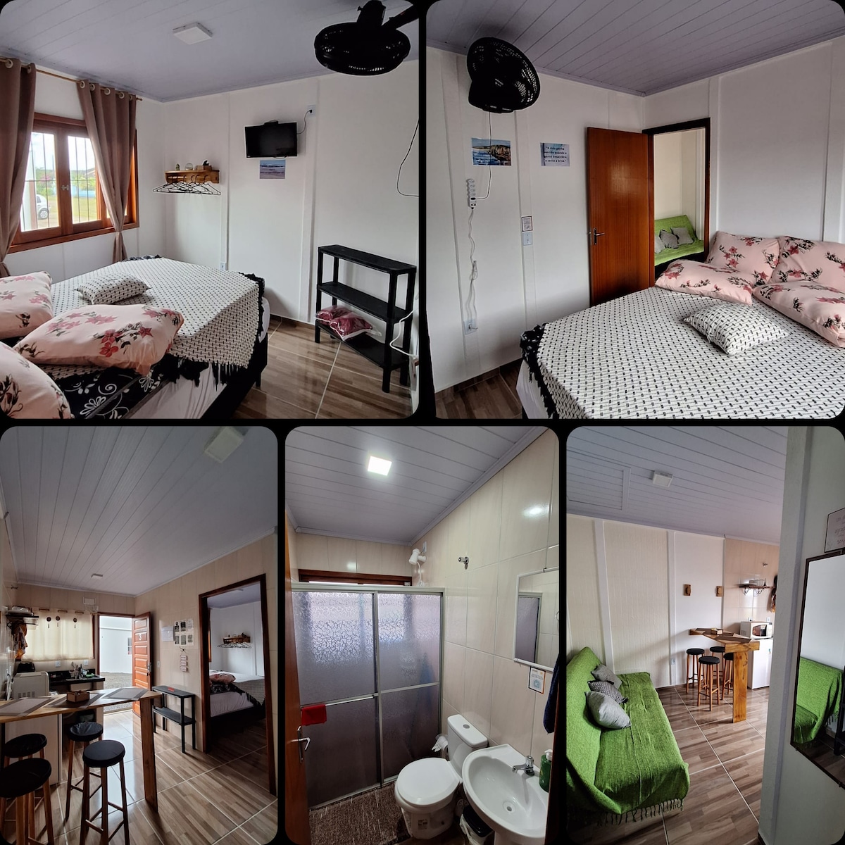 快適さと実用性を求める方に最適な環境です。 統合された環境:ダブルベッド、冷房、テレビ、Wi-Fi 500 mg、ダイニングテーブル。2口のコンロ、電子レンジ、コーヒーメーカー、冷蔵庫、トースター、エアフライヤー、電気ポット、サンドイッチメーカー、家庭用品、寝具を備えたミニキッチン。子供用ソファ、ベビーカー。 注:バスタオルや洗面用品は提供しておりません。ペットの同伴はお断りしております。