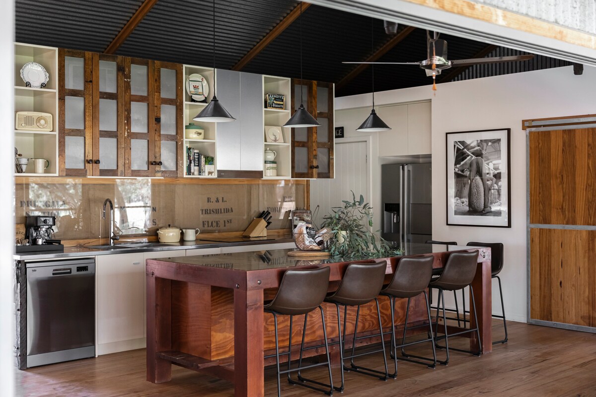 You'll be Udder-ly amazed that this completely renovated home was once a fully functioning Dairy. Spacious yet cozy open plan kitchen, dining and living area. Vaulted timber ceilings and original steel rafters. The kitchen has everything you need including a dishwasher, oven and coffee machine. Sit and sink into the comfiest couch and snuggle up to watch a movie or the footy on the TV. But if you're here to digitally disconnect, we have a bush TV (outdoor fire pit), board games and bushwalks!