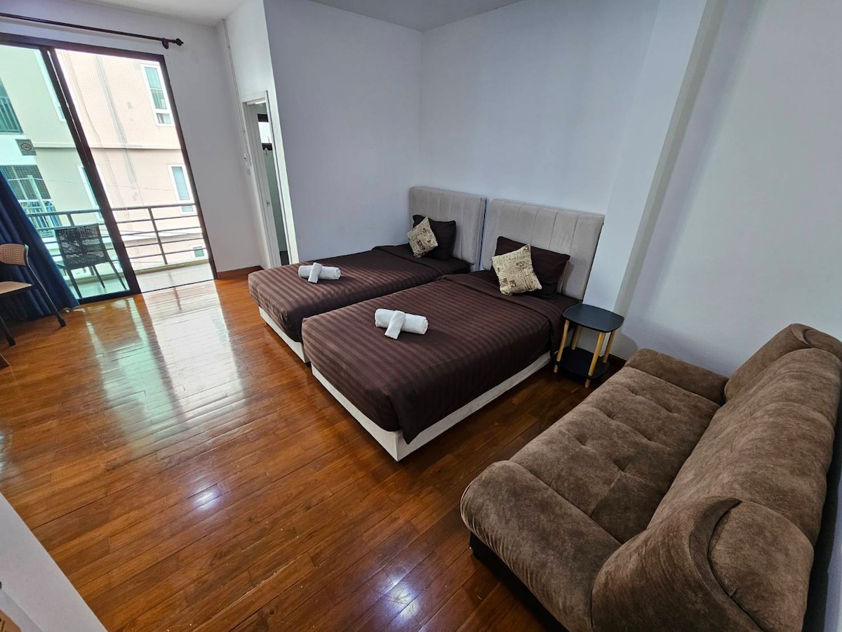 Close to Don Mueang Airport, just 15 minutes away. Near the Red Line Skytrain, 7-Eleven, and an international buffet food court.
