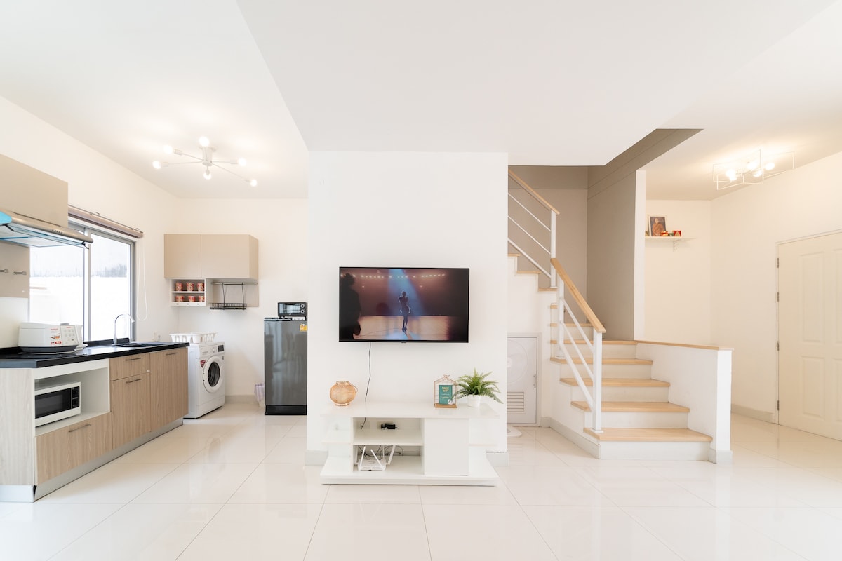 快適でリラックスした滞在に必要なものがすべて備わった、美しくデザインされた家に家族みんなでお越しください。 注目ポイント • 2階建ての一戸建て • 200平方メートルの居住空間 • 専用駐車場。 •キングサイズベッド付きの寝室2部屋 • バスルーム2室とジャグジー • 設備の充実したキッチン •広々とした庭 近くには: • DMK空港(10 km) • IMPACTアリーナムアントンターニ • MRTダークレッドライン •ゴルフクラブ バンコクを車や公共交通機関でシームレスに探索できるようにします。