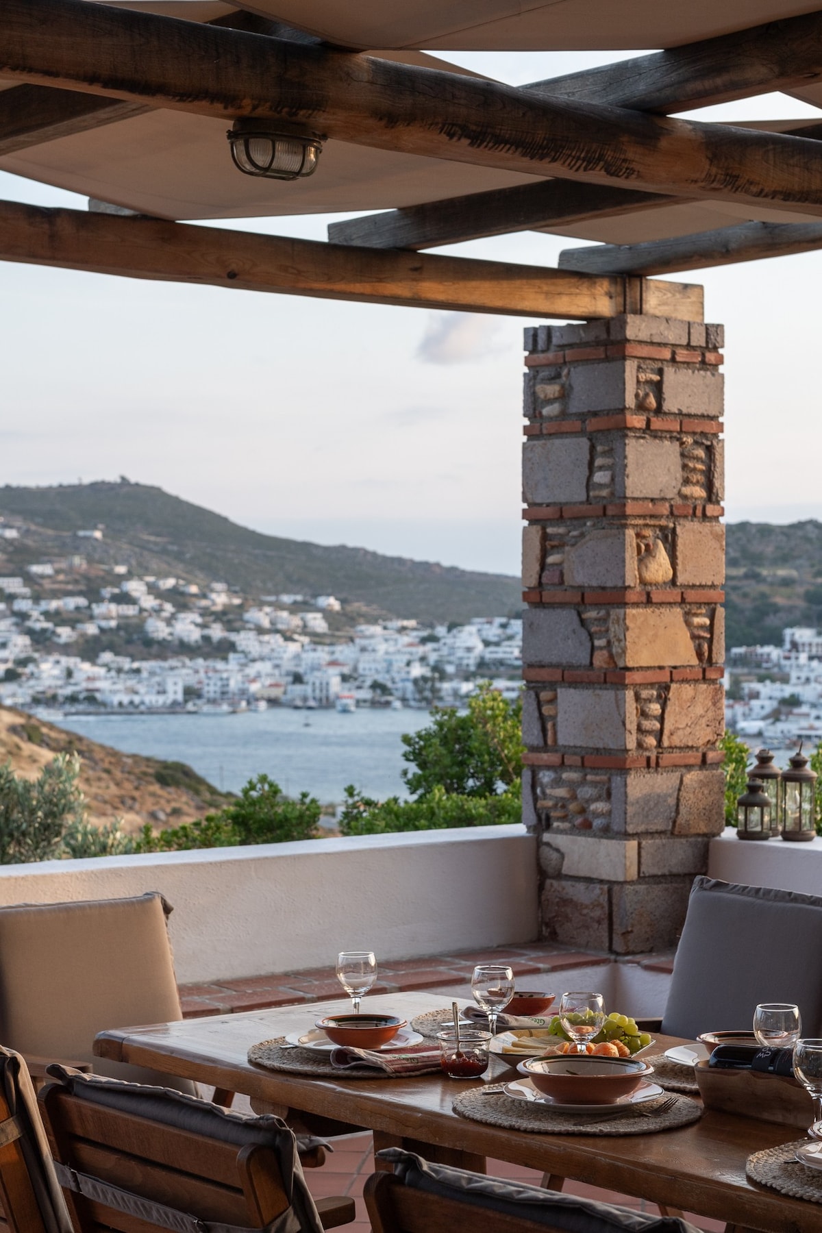 Gated seclusion, stunning architecture, spectacular sea and island views and superb details define this unique property perched on a mountain-top overlooking the Aegean. The gently curving infinity pool, the massive hand-carved 150-year-old teak doors and cabinetry, the Byzantine chapel design of the master bath, and more make this the premier rental property in the most scenic part of the island, just a few minutes from the best beaches, restaurants, activities and amenities that Patmos offers.