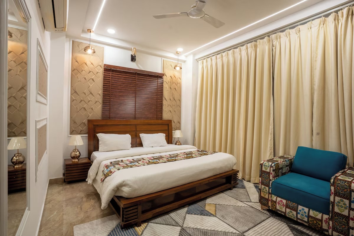 キングサイズのダブルベッド、エアコン、専用バスルームが備わった快適なデラックスルームです。カップルや小さなファミリーに適しており、追加ゲストのリクエストに応じて追加のフロアマットレスをご用意しています。 高速Wi-Fi、毎日のハウスキーピング、電源バックアップ、共用エリアへのアクセスが含まれます。ハリドワールで清潔で落ち着いた便利な滞在を求める旅行者に最適です。 鉄道駅とバス停に近いです。 ハリドワールで最高のコスパ!