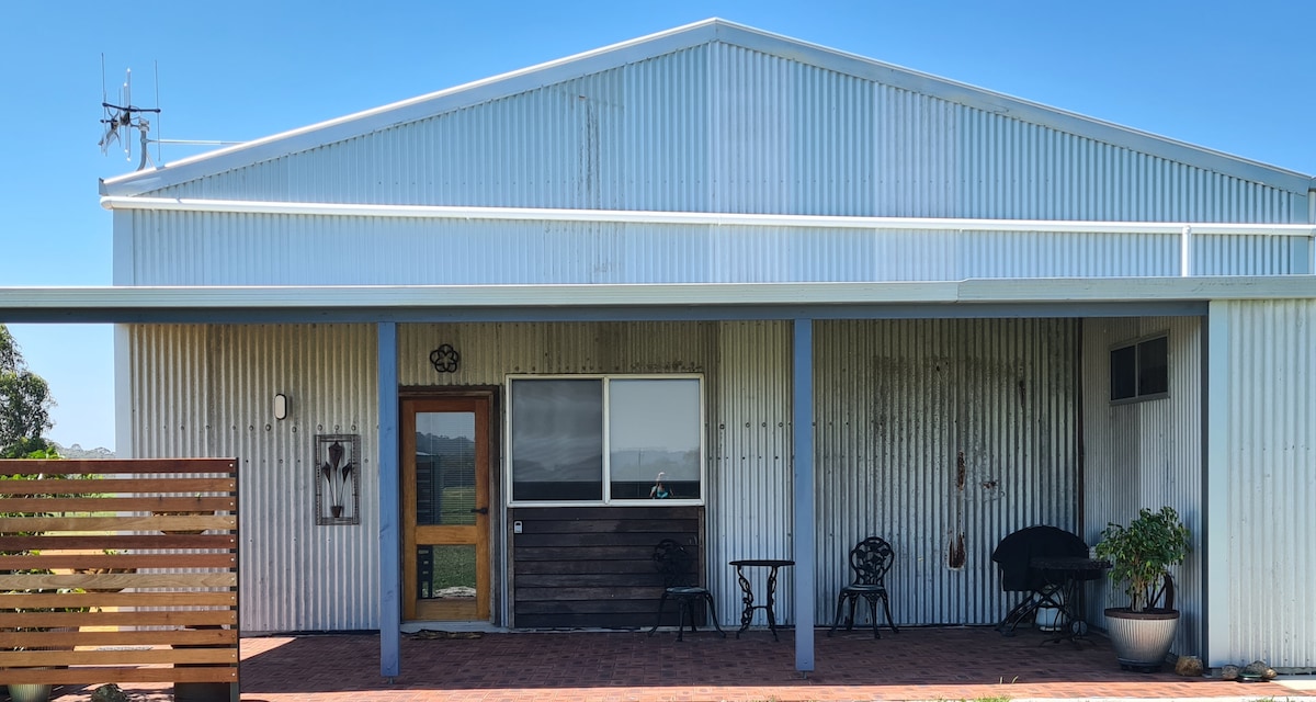Self-contained 1 bedroom cottage less than 5 minutes walk to town. Stove top, microwave, electric frying pan and slow-cooker provided. Large, covered front veranda overlooks a panorama of trees, pastures and the town, which is very pretty at night. Built at the rear of my home you will have total privacy but I am happy to give you advice on the wonderful things Denmark has to offer.