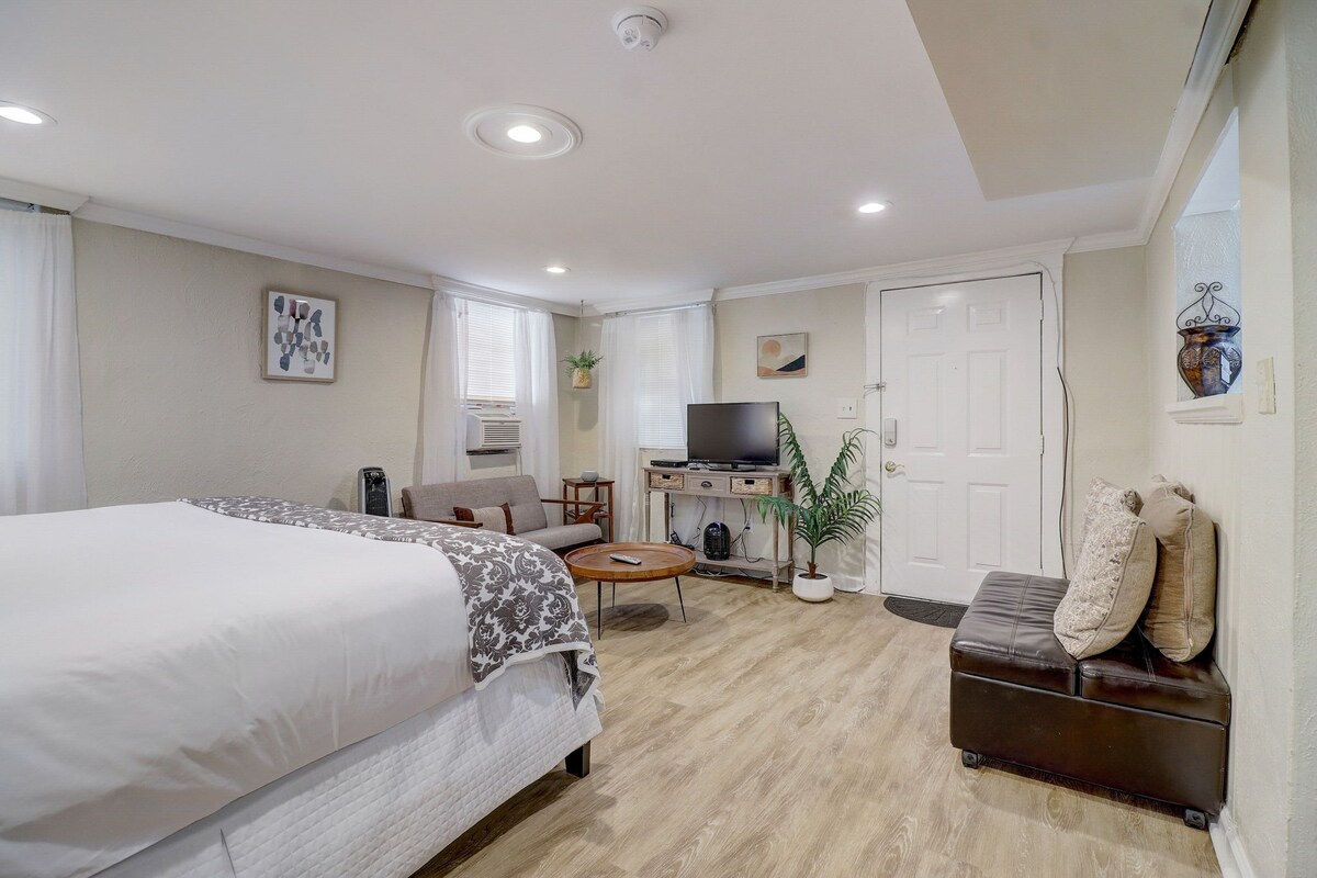 ディケーターのオークハースト地区にある一軒家の1階にあるプライベートスイートで、フルキッチン、居心地の良いクイーンベッドルーム、プルアウトクイーンソファベッドが備わっています。 大きな窓から自然光が差し込むか、玄関先のポーチでコーヒーをお楽しみいただけます。 •レストランなどがあるオークハーストビレッジまで徒歩5分 •アグネススコット大学まで徒歩10分 •ディケータースクエア&マルタまで徒歩24分 • 隣接する家にドアがない独立した玄関 • 家との共用エアダクトのない個別の空調設備