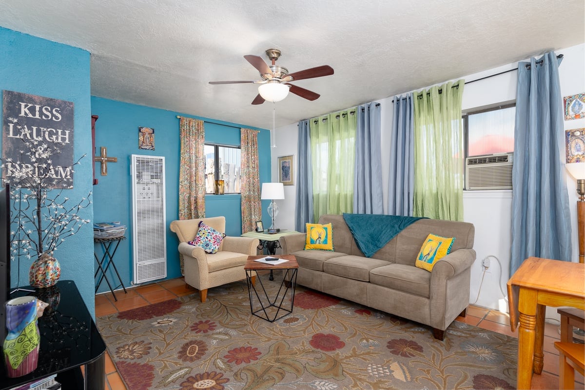 サンタフェの南側にある、リラクゼーションのために設計された静かなスイート。 599号線の近くのサウスサイドにあり、プラザから20分です。 メインルームはスタジオスタイルで、小さなリビングエリア、クイーンサイズベッド、食事/仕事エリアがあります。 コーヒーや紅茶がお好きな方に必要なものがすべて揃ったキッチンエリアには、電子レンジ、ケトル、ドリップ式コーヒーメーカー、エアフライヤー、冷凍庫付きミニ冷蔵庫が備わっています。 バスルームにはウォークインシャワーと自然光があります。 スイートは私たちの家の一部で、壁を共有していますが、専用の玄関とパティオがあります。