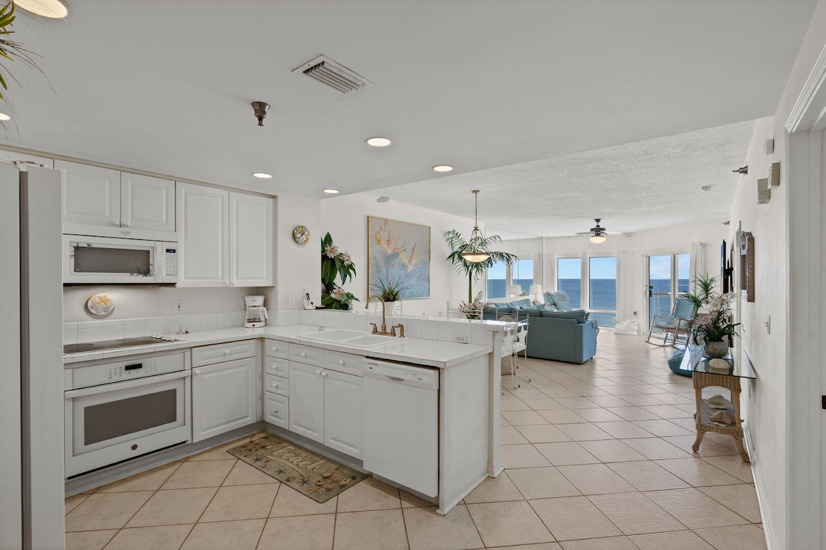 この美しい5つ星のガルフフロントコンドミニアムを体験してください。ガルフサイドの温水プールとジャグジーがあります。この新しく改装されたユニットは、素晴らしいガルフビューのある専用のガルフフロントバルコニーを備えており、イルカを見たり、2つのガルフサイドプール、1つの温水プール、ジャグジーで泳ぐことができます。 6名様用、ガルフフロントバルコニーマスター、2寝室、2バスルーム、マスタースイートには豪華なキングサイズクラウドラグジュアリーテンピュールベッドがあります。 ゲストルーム2にはユーロトップのプラッシュクイーンマットレスがあり、リビングルームにはメモリーフォームのクイーンソファーベッドがあります。