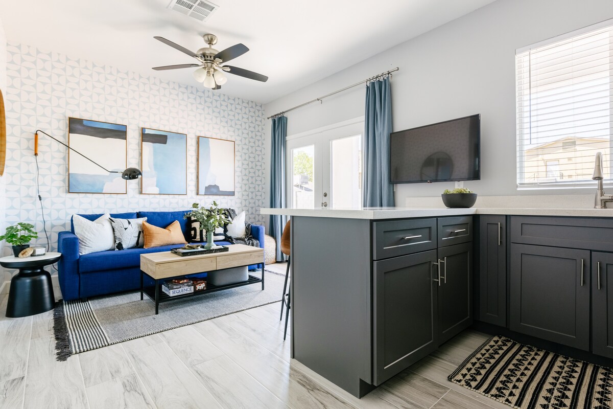 This modern casita has all the comforts you need for a memorable stay! Step inside to discover a space with all of the essentials. The open-concept seamlessly connects the living room, dining area, and kitchen, creating a welcoming atmosphere for relaxation and socializing. Step outside to your own private back porch, fully fenced in for your peace of mind and privacy. Whether you're sipping your morning coffee or stargazing in the evening, this tranquil oasis is the perfect spot to unwind!!