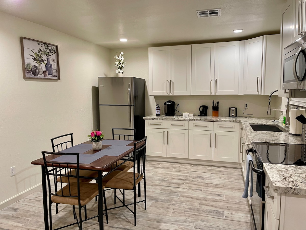 私たちのスイートの快適さを発見してください。 スムーズなセルフチェックインで、フルキッチン、長期滞在向けの洗濯機・乾燥機をご利用いただけます。 机、安定したWi-Fi、テレビ放送、Netflix、Huluを備えた2台のRoku TVがあり、仕事と余暇を楽しくします。 豪華なキングサイズベッドや引き出し式ソファで休んだ後は、モダンなシャワーでリフレッシュしましょう。 専用玄関からパティオの静けさをお楽しみください。 無料の路上駐車場で、手間のかからない体験をお楽しみいただけます。