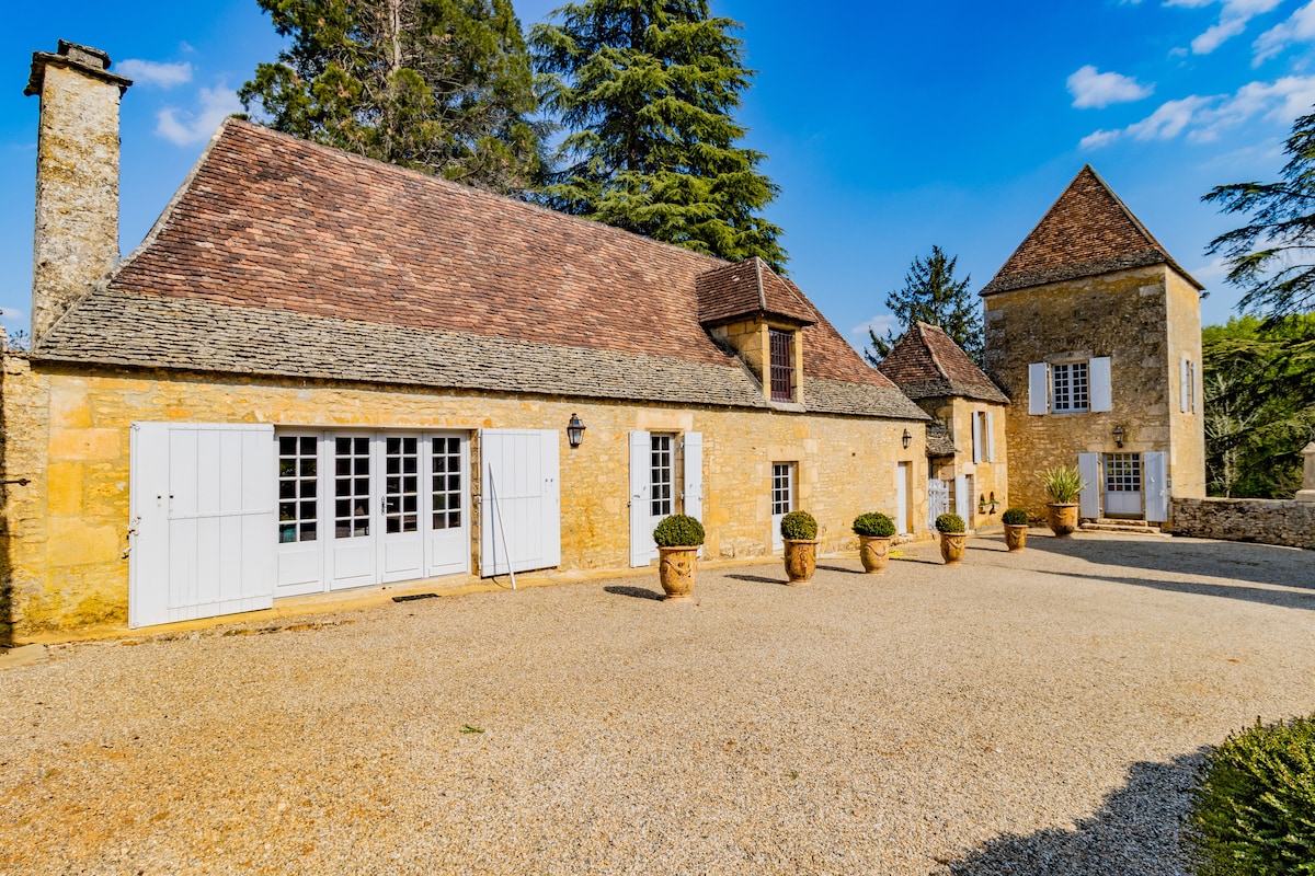 (English below) An elegant 14th century chateau nestled in a park surrounded by high walls with a swimming pool. A property full of character with many original elements, along with a lovely covered terrace great for 'al fresco' dining with the family, overlooking the gardens and pool area. A perfect French country retreat in the heart of the Perigord, Dordogne. Lovely spot to meet up with your family or friends or colleagues.