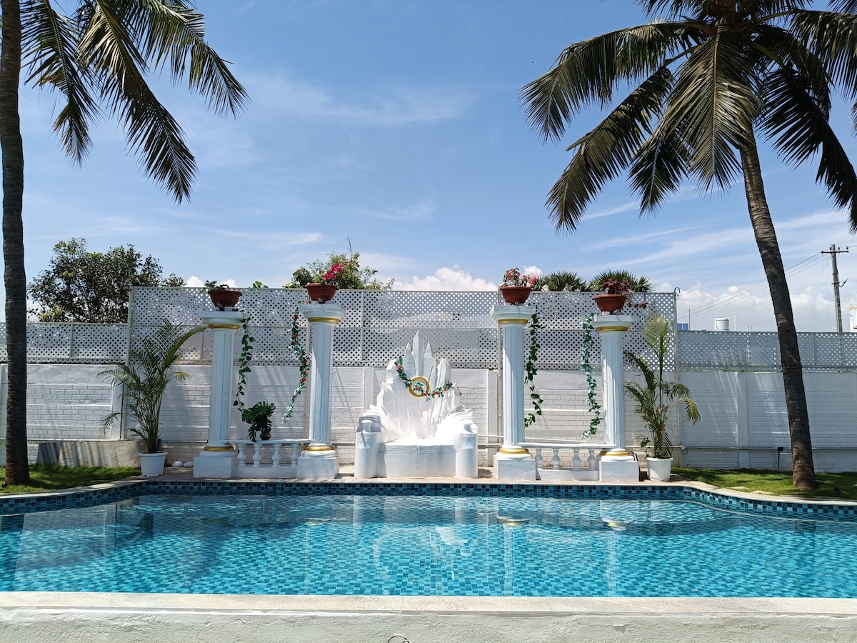 家族全員がのびのび楽しめる最高の宿泊先です。100年以上の歴史を持つ家を改装し、現代的なアメニティ・設備、広々とした客室、チェティナドの木製の柱などを備えています。大人4人+子供2人または大人5人のご家族に最適です。エアコンとバスルーム付きの寝室とリビングルームは、モダンなキッチン、庭、オープンテラスにつながっています。管理人は24時間365日対応しています。ご要望に応じて、清掃と洗濯サービスをご利用いただけます。 この地域の寺院ツアーを計画している方に最適です。 立地:GSTロードからアラスール方面へ8 km。