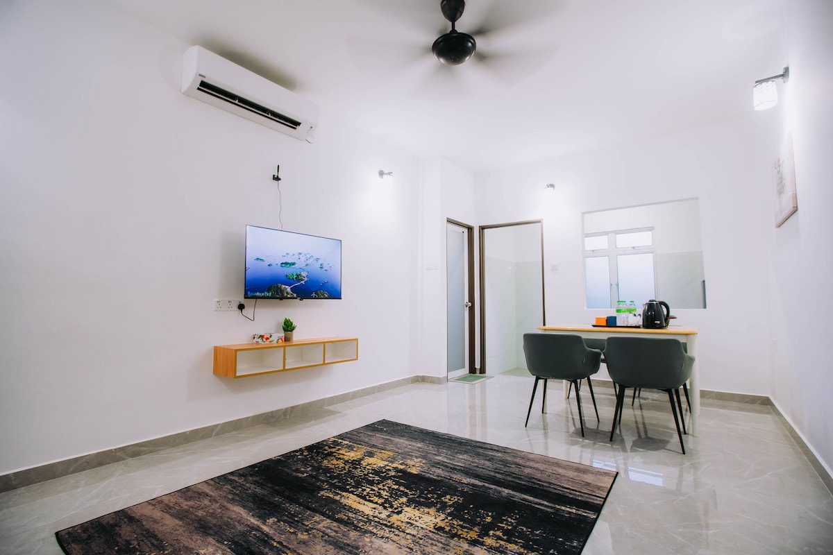 Welcome to Calme Luna Suite, with 4 bedrooms and a stunning front-facing pool. Located just a short distance from Kuala Terengganu's city center and attractions, our home offers the perfect blend of luxury and comfort for your getaway. Step inside to discover a modern interior with ample indoor and outdoor spaces designed for relaxation and socializing. The open-plan living area is perfect for family gatherings, featuring comfortable seating and a dining area where you can enjoy meals together.