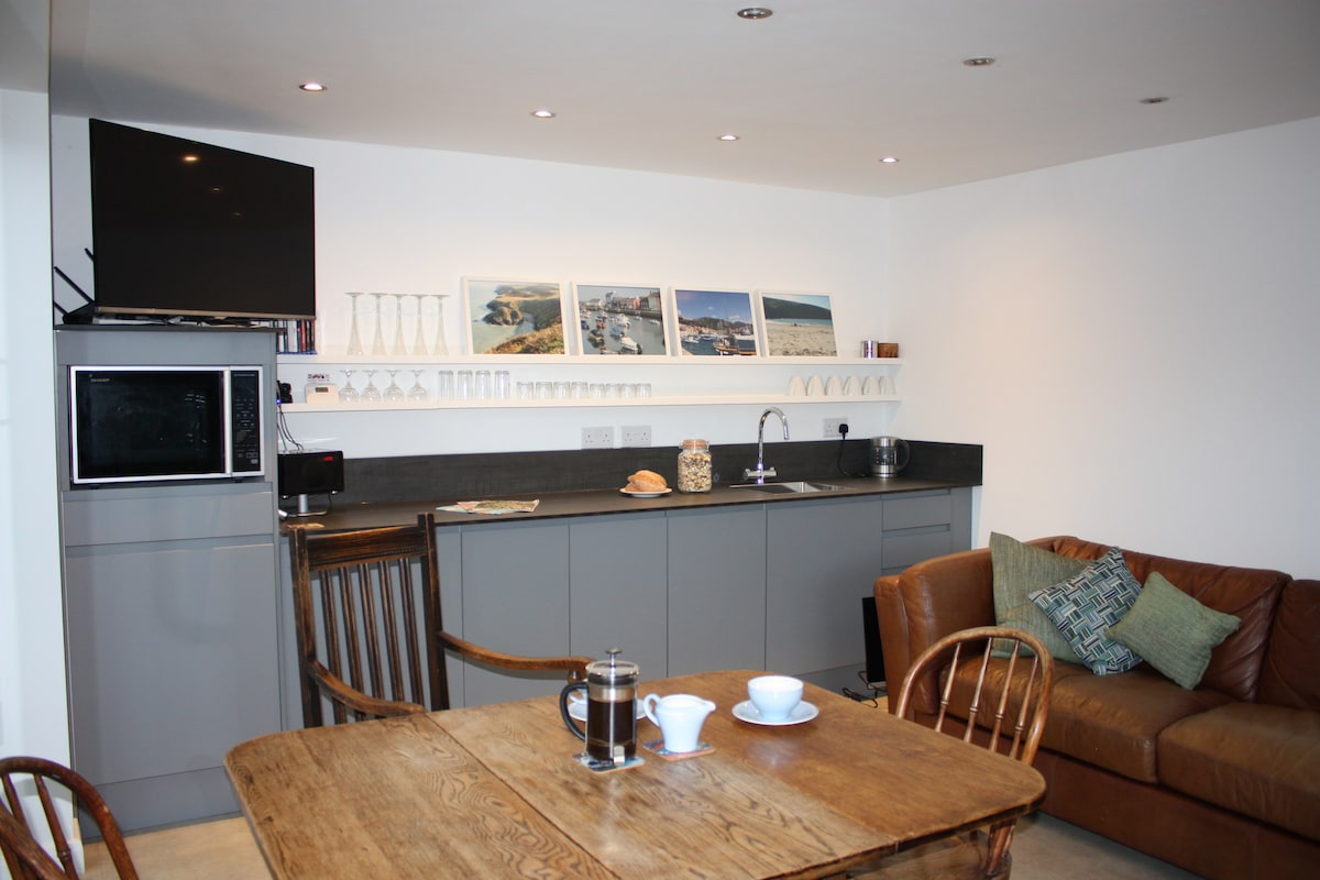 2018年に非常に高い基準で修復されたOld Stablesは、2つのベッドルーム(どちらも専用シャワールーム付き)を備えた非常に快適で広々とした宿泊施設を提供しています。 リビングスペースはオープンプランで、広い座席エリア、ダイニング、設備の整ったキッチンがあります。 2組の二つ折りドアがあり、谷の向こうに素敵な景色が見えます。 床下暖房により、コテージはとても暖かく快適です。 Wi-Fi接続があり、駐車場は充実しています。