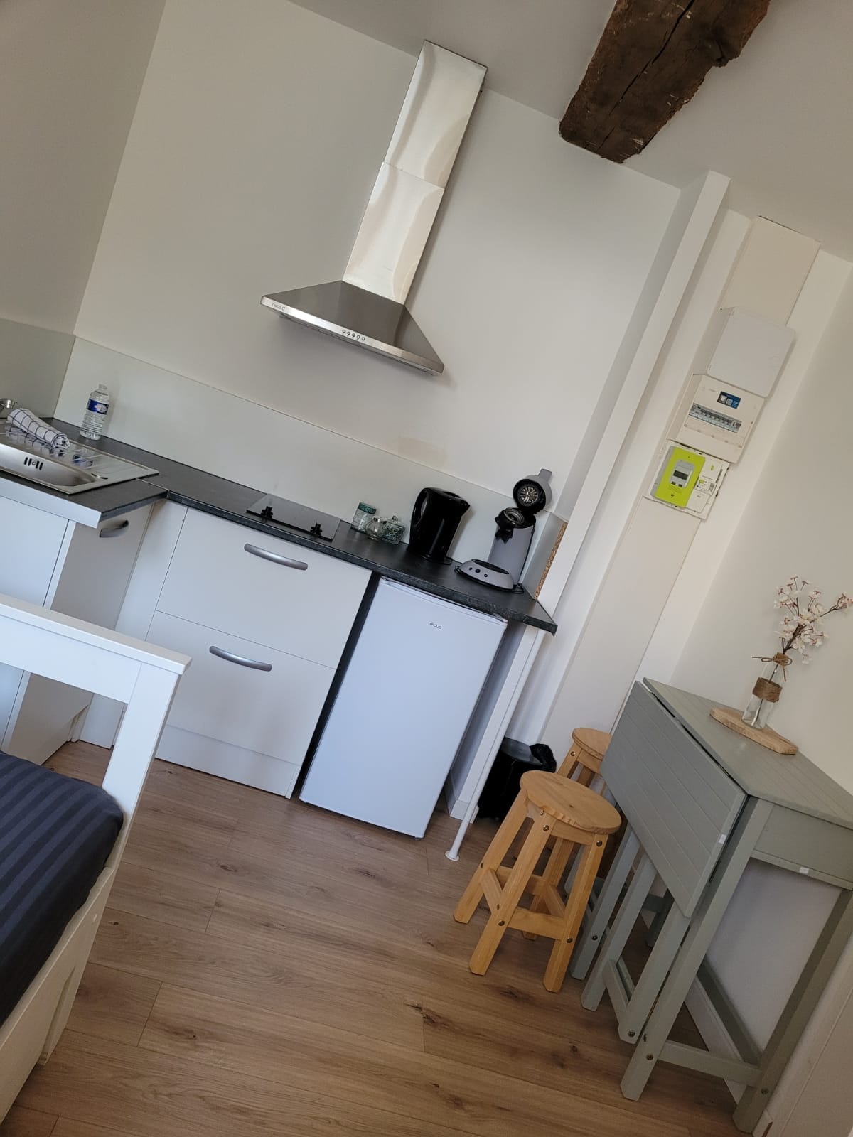 スタジオは、寝室(ベッドメイキング)、シャワールーム(シャワーと洗面台、タオル付き)、簡易キッチン(電気コンロと電子レンジ)、トイレを含み、15世紀と18世紀の城の1階に位置しています。静かな花と木々に囲まれた環境で、村から1kmのところにあります。 「城での滞在」の広告を通じて、2つの部屋をご利用いただけます。(Airbnbの広告を参照)