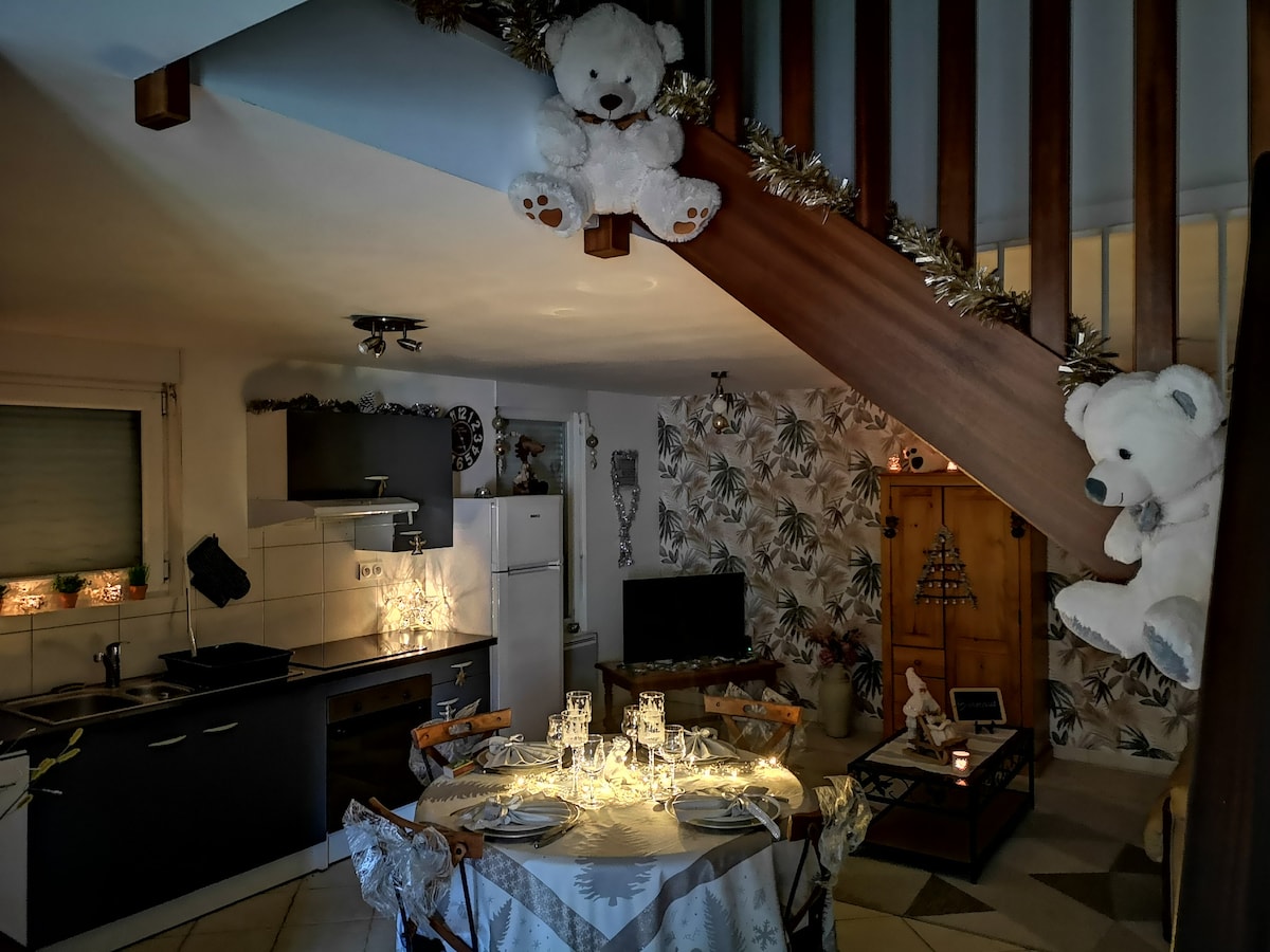コロンバージュ(木骨造り)の家: 1階: オープンキッチン、薪ストーブ付きダイニングルーム、リビングルーム、バスルーム、トイレ。 2階:中二階に寝室があります。 囲まれたプライベートガーデンには、デッキチェア、ガーデン家具、バーベキュー設備が備わっています。 車用の中庭の安全な駐車場。 2台のオートバイ用の安全なガレージ。 ベッドリネン、タオル、キッチンタオルが用意されています。 ハイキングガイドをご用意しております。