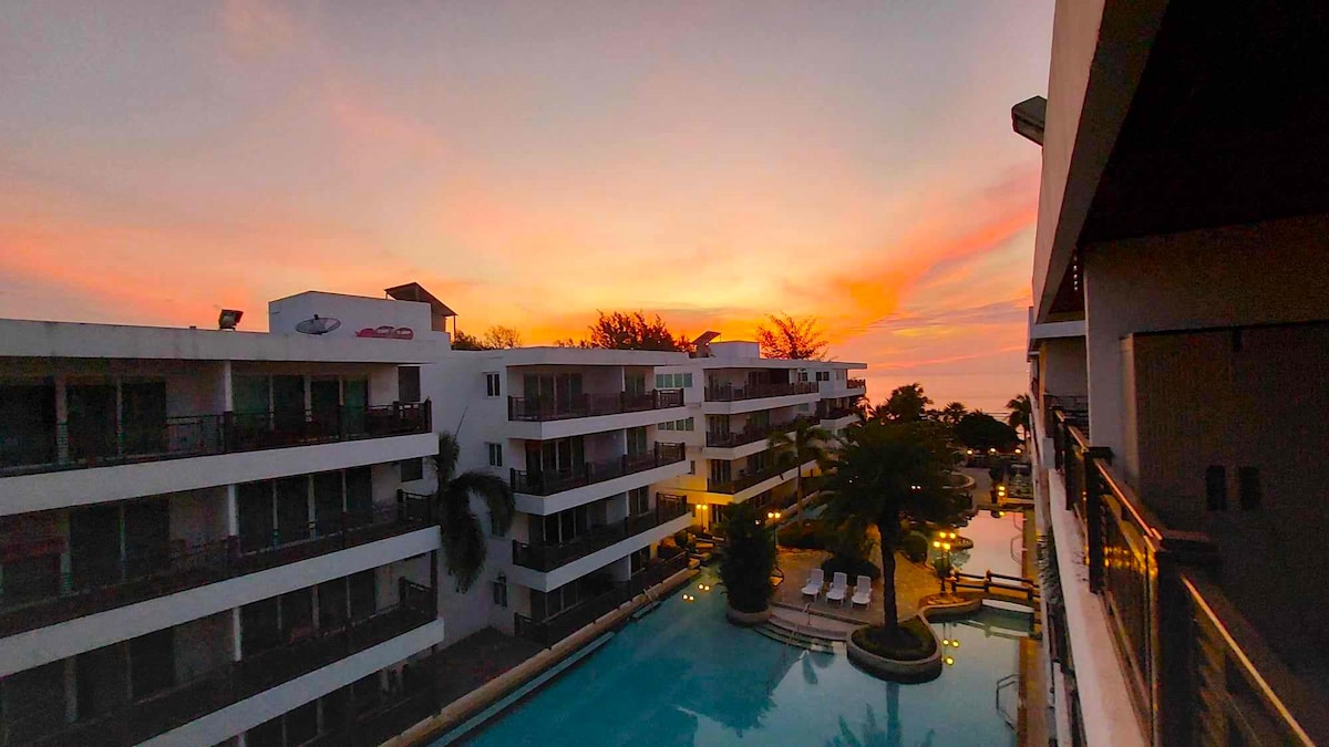 ビーチフロントアパートメント・バルコニー、シービュー&プールビュー-チャアム-ハウハインは、屋外プール、庭、専用ビーチエリアを備え、無料Wi-Fiと海の眺望を備えたチャアムの宿泊施設です。 このアパートメントラベル用の無料駐車場を備えており、ハイキングやサイクリングが楽しめるエリアにあります。