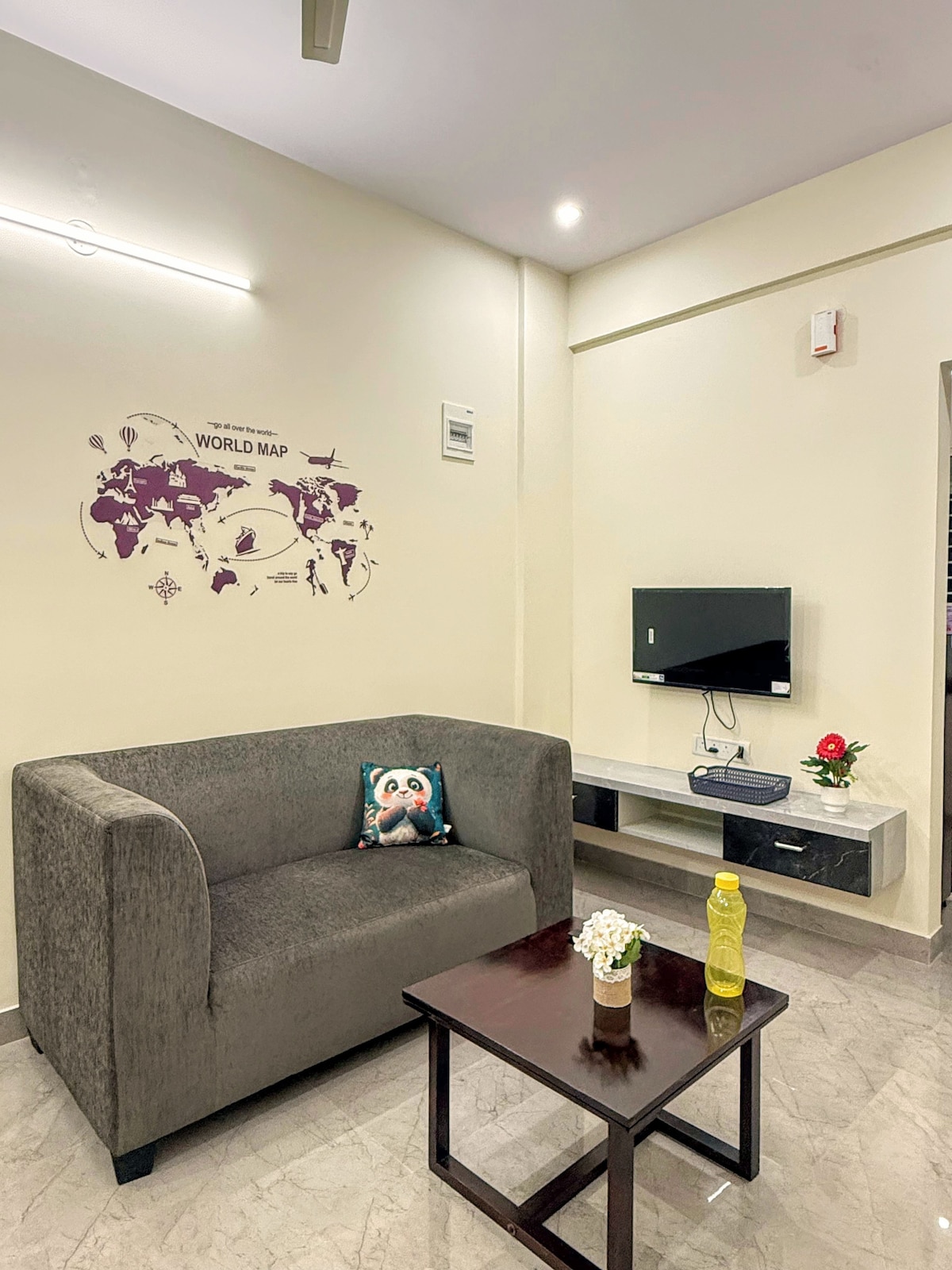 Fall in love with this boutique-styled one-bedroom flat. Experience comfort with the best-in-class sofa featuring a chaise lounge (extra soft), as well as a cot and mattress for your ultimate relaxation. I'm sure you'll find yourself drifting off to sleep on the chaise lounge itself. Have fun in the kitchen with all the necessary utensils provided. The vibrant colors of the walls will uplift your mood. Whether you want to relax with your loved ones or focus on work with blazing 300 Mbps speed.