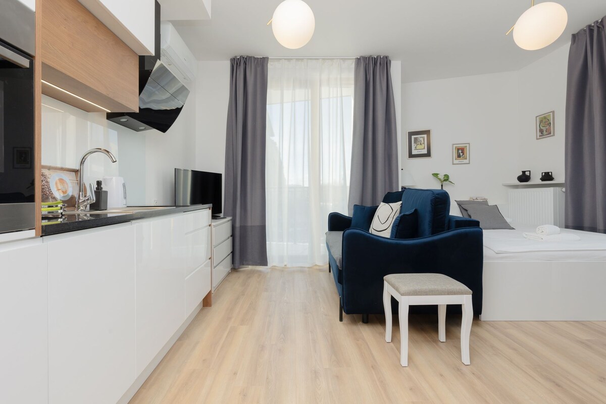 スタジオアパートメントは市内中心部にあります。文化宮殿から1 km、中央駅から1.4 kmです。新鮮でモダンで快適に仕上げられ、設備が整っています。明るい色のシャワー付きの大きなバスルーム、エアコン、ダブルベッド、Wi-Fi付きケーブルテレビがあります。オープンキッチンには、電気コンロ、冷蔵庫、洗濯機、コーヒーメーカー、電気ケトルがあります。棚、ハンガー、アイロンを備えた広々としたクローゼットをご用意しています。