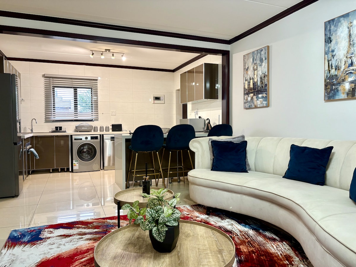 We welcome you to relax in our calm and luxurious space situated in a quiet section of Fourways. The apartment is uniquely and tastefully designed with amenities that radiate style and comfort. Treat yourself to this stunning apartment with a queen size bed, a fully equipped kitchen and a modern bathroom. Unwind on the patio or on the couch and enjoy a TV with Netflix and Youtube. The apartment has electricity backup that runs the TV and the Wi-Fi. Book your stay today and indulge in luxury.