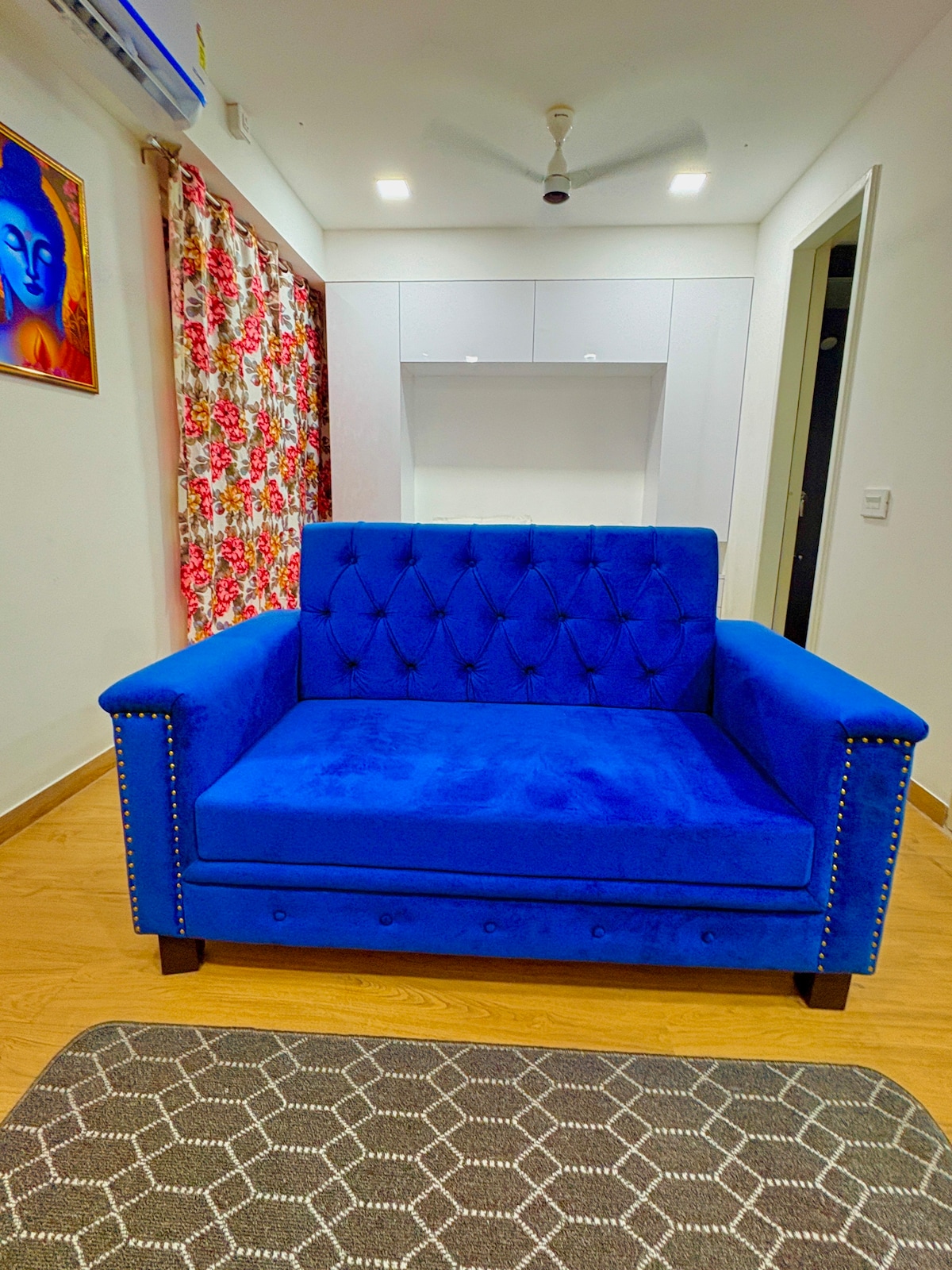 こちらは完全に家具付きの2bhkサービスアパートです。どちらの部屋にも、キングサイズのベッド、ベッドサイドテーブル、食器棚、書斎テーブルと椅子、エアコンが備わっています。 キッチンには必要なアメニティがすべて揃っています。 ホールとダイニングエリアには、ダイニングテーブルと椅子、ソファセット、ティーポー、サイドテーブル、その他の家具が備わっています。 ホールには大型のスマートLEDテレビがあります。 この宿泊施設には、マスタールームにバルコニーが1つ、ホールエリアにバルコニーが1つあります。バルコニーからの眺めがとても良いです。