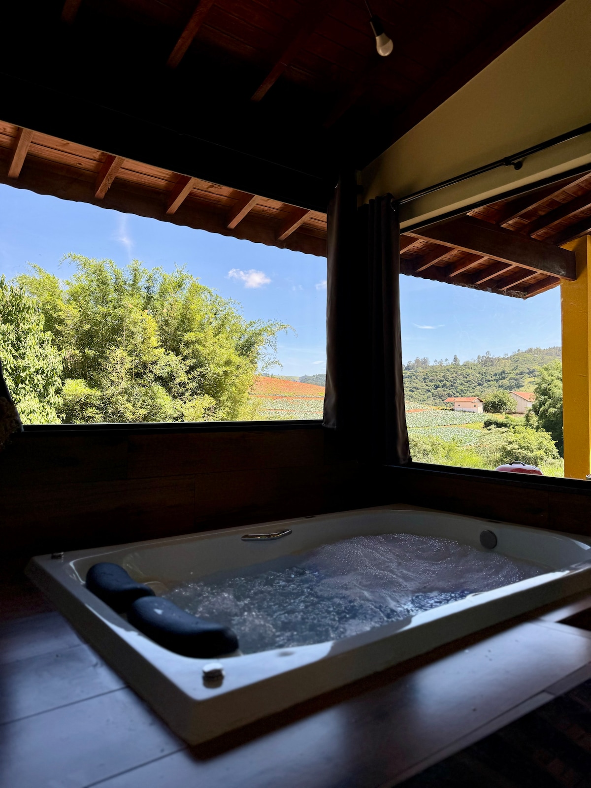 専用シャレー、専用玄関と駐車場、フロアファイヤーと3つの釣りタンクを備えたレジャーエリア、舗装路から400メートルの家族経営の農場内、市場やパン屋の近く、完全なプライバシー、山を望む楽園の景色を持つジャグジー、ジャグジー通路のバスルーム、クイーンベッド、キッチン用品と2口のコンロ、43インチスマートテレビとWi-Fi。この施設内には2つの完全に独立したシャレーがあります。