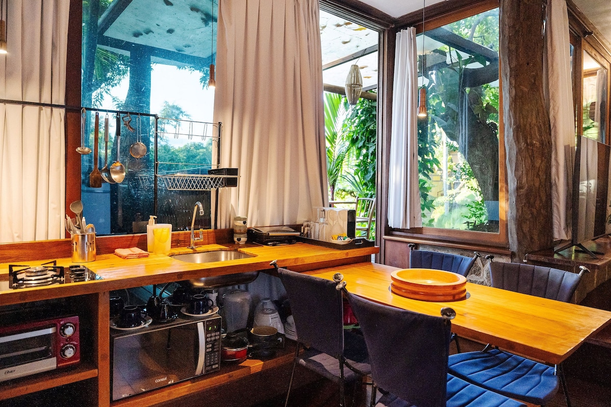 細部に至るまで芸術的に建てられたバンガロー...森に面したガラス天井のバスタブは、百年のイチジクの木と多くの鳥とともに、自然に浸かっているような感覚を与えます...このアトランティックフォレストの保護地域とのつながりで、自然との親密で居心地の良い環境です。 もう一つの温水シャワーは森に面したオープンデッキにあり、昼夜を問わず星空や月明かりの下で楽しめます。