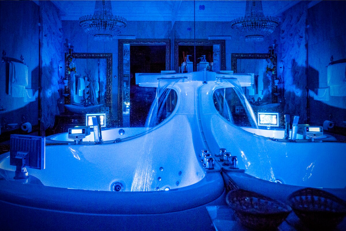 La stanza rossa è dominata dalla grande doccia con cromoterapia la quale, aprendosi attraverso un pannello verso la stanza, diventa un elemento architettonico caratterizzante, trasformandosi in una lampada d’ambiente. Le bianchi travi e i tagli di luce sono altri elementi che rafforzano il carattere della camera. Il divano bianco, posto di fronte alla tv a schermo piatto ti permetterà di godere al meglio il tuo film preferito. La stanza è dotata di bagno privato.