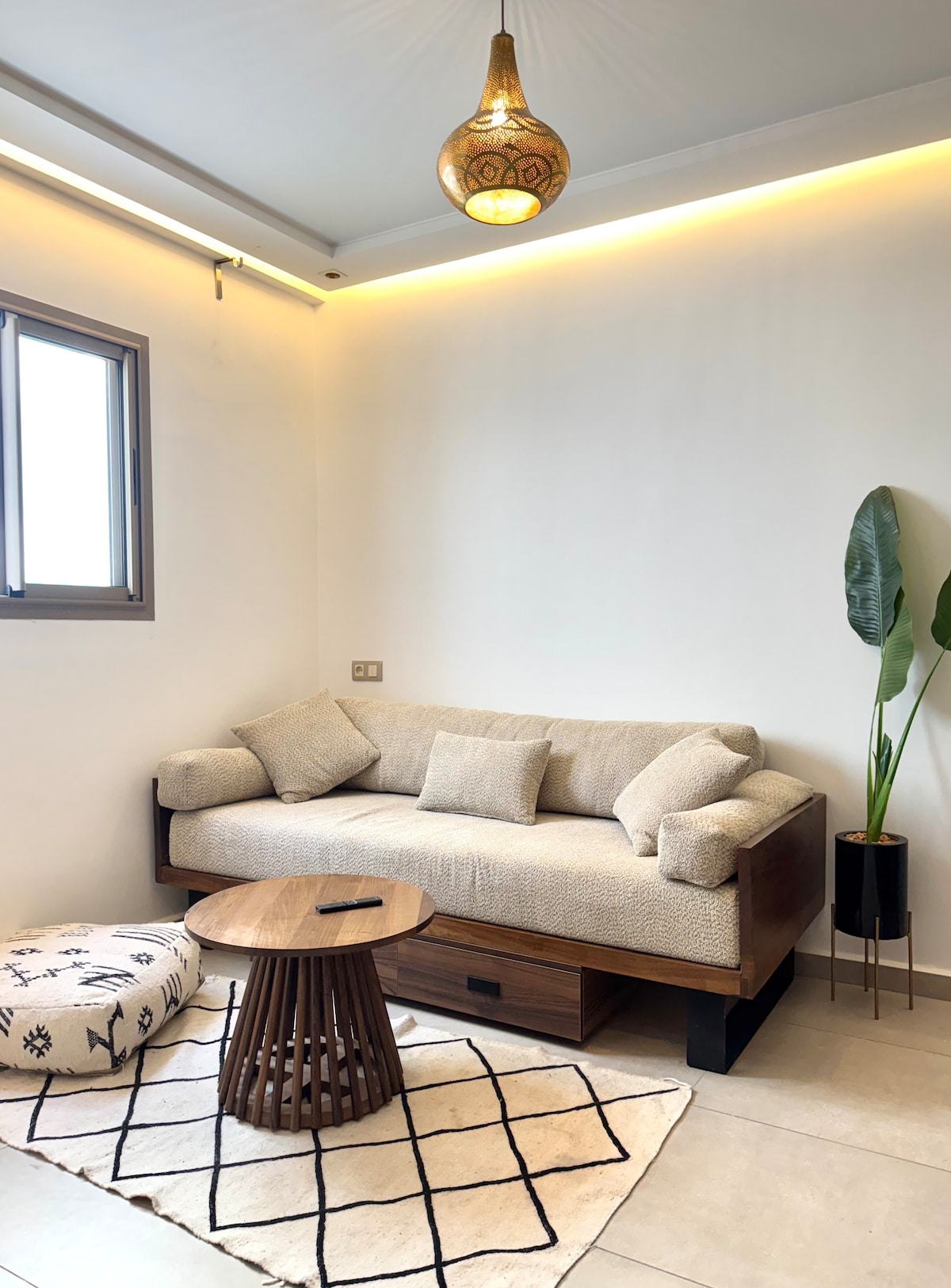 A modern studio apartment with a Moroccan flair. Open-plan living area features comfy sofa with pillows, that doubles as an extra bed, smart TV with Netflix, high-speed WiFi, and a fully equipped kitchen. The bedroom includes queen bed, and a wardrobe with hanging rail, drawers, and woven baskets for storage. Bathroom has walk-in rain shower, illuminated mirror, vessel sink, soap dispenser, toiletries shelf. Perfect for surfers and those seeking serene coastal comfort and convenience.