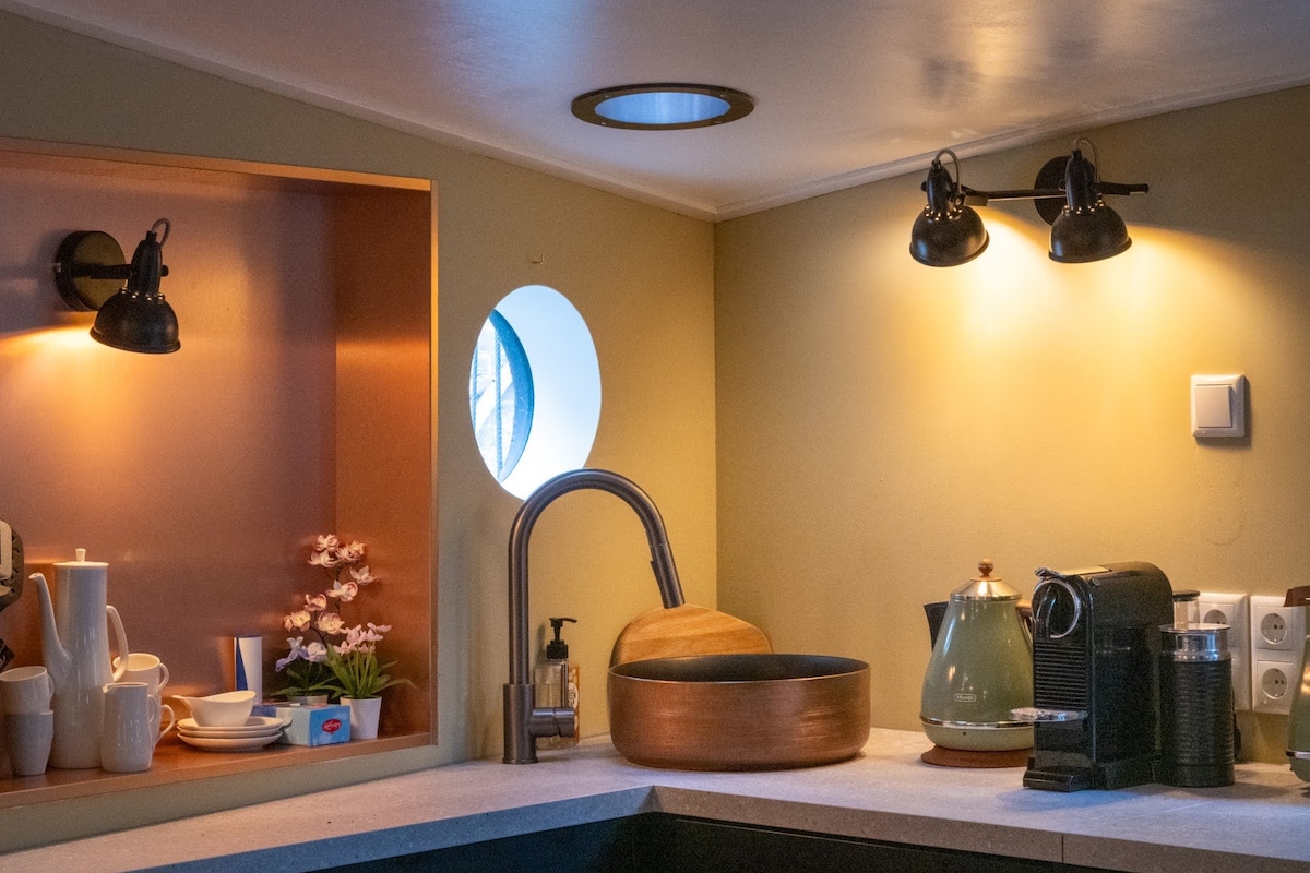 ハウスボートに泊まりに来てください!大きなダイニング/リビングルーム(2人用の快適なベッドソファを含む)と2階に別のトイレを備えた専用のゲストハウスを提供しています。下の階には、水辺を眺めるクイーンサイズベッドと、シャワーと大きなバスタブのあるバスルームがあります。正面にテラスがあり、いくつかの座席とスイングベンチがあります。中心部に非常に近い美しい緑豊かな通りにあります。中央駅からトラムで2駅または徒歩15分です。朝食は提供していませんが、ご自身で準備するための素敵な基本的な食材をたくさんご用意しています。