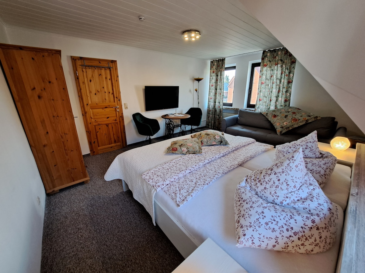 Das ideale Apartment für große Familien, Freundeskreise, Seminare. Genießen Sie einen tollen Ausblick von einem Ihrer beiden großzügig geschnittenen Balkons im ersten Stock und im Dachgeschoss. Hier haben Sie jede Menge Platz: Zwei Schlafzimmer mit Kingsize-Doppelbett, zwei Duschbäder und zwei Wohnzimmer mit Schlafcouch. Helle, lichtdurchflutete, liebevoll gestaltete Räume. Einzeln ausgesuchte Möbel in harmonischen Arrangements in besonderem Ambiente.