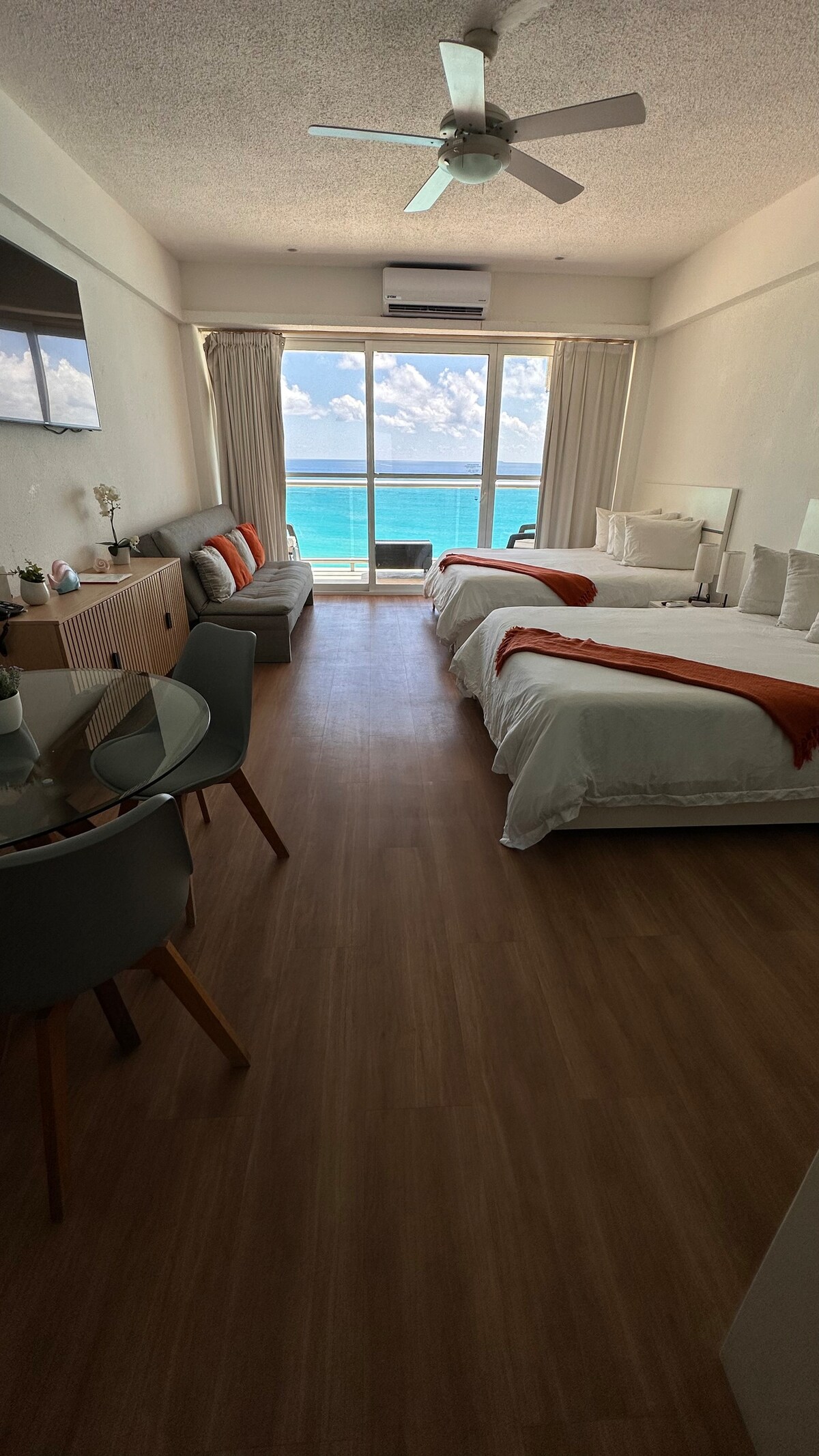最近改装された、ビーチビュースタジオアパートメント。カンクンのホテルゾーンの中でも最も活気のあるエリアにありますが、それでもリラックスするのに最適です。9.5km、ハードロックカフェのすぐ隣、24時間営業のコンビニが近く、24時間営業のバスサービスがすぐ目の前、最高のクラブやディスコがあるパーティーゾーンまで徒歩圏内、そしてもちろんエレベーターで行けるところには、ターコイズブルーのカリブ海があります。