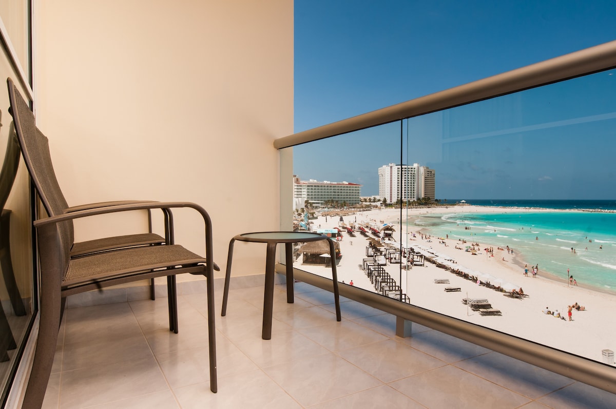 Directly on the beach. Views are spectacular as soon as you walk through the front door. Both the living room and the bedroom have views of the sea. Facilities like pools, jacuzzi, lounge chairs, shades, gym, tennis court are available for you (for free) High speed Wifi All inclusive optional through the hotel for food and drinks as we share facilities with Oleo Cancun resort (today $95 usd p/p per day) There are also 3 restaurants across the street (a la carte) + a convenience store.