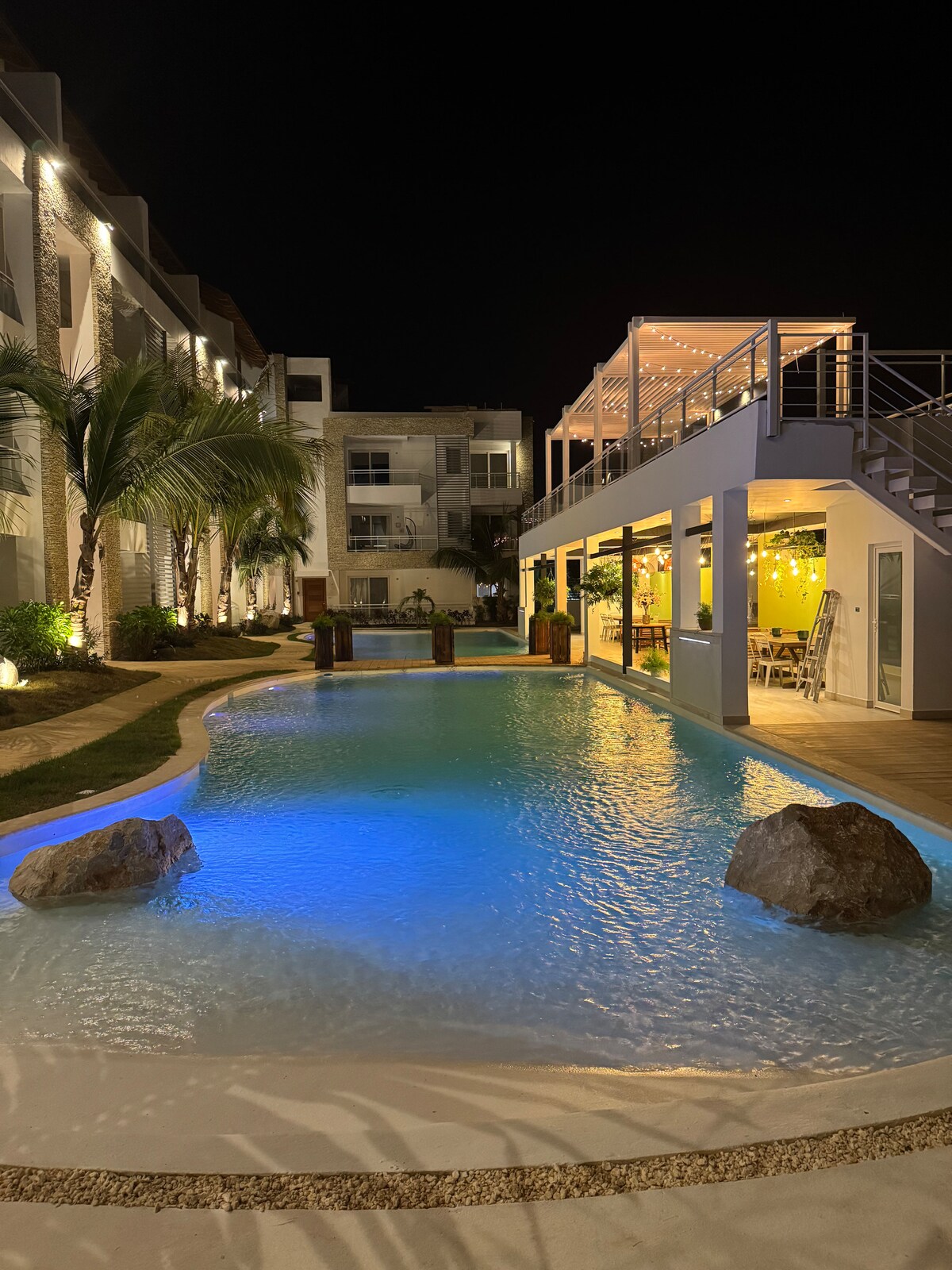 Apartamento situado dentro de un complejo hotelero con playa privada y 2 piscinas para pasar unos días en tranquilidad. Tiene una habitación y dos mezzanine, cable, wifi, Áreas de Juego para ninos. Parque acuático solo de viernes a domingo. Cocina completamente equipada y cuanta con dos aires acondicionados. Cuenta con balcón y está a pocos metros de la playa. El complejo cuenta con restaurante, minimarket, iglesia y parques de juegos