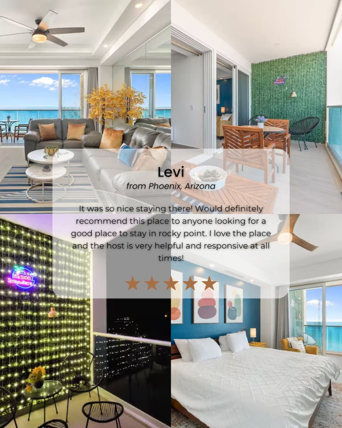 現代的なエンカンタメタワーズリゾートデベロップメントにある、新築の豪華で設備の整ったビーチフロントの2ベッド、2バスルームのコンドミニアムで、4階の素晴らしい眺めをお楽しみください。総面積1,556平方フィート。 エンカンタメタワーズは、ロッキーポイントとしても知られるメキシコのプエルトペニャスコにあるプラヤエンカントの最新のビーチコミュニティ内にあります。 この宿泊施設には、高級なレストラン(Santo Coyote)、町で唯一のスターバックスがあるBlue Palm Cafe、モダンなジム、11のプール、コンビニがあります。