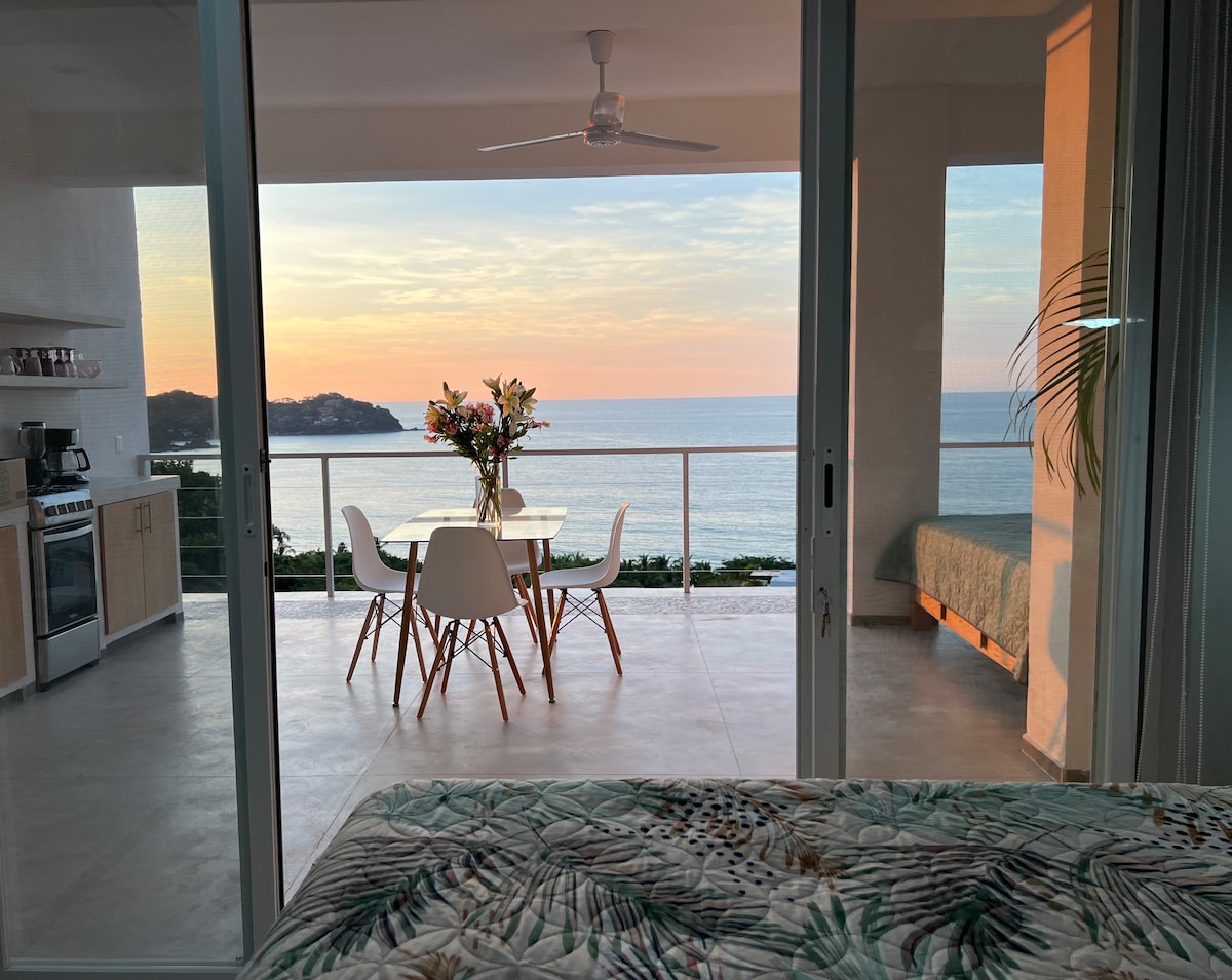 Romantic studio with panoramic ocean views in the tranquil north end of Sayulita a few blocks uphill from the beach. *Brand new, completed December 2022! *High speed wifi via Sayulitawifi *42" Smart TV *Air con, ceiling fans *Kitchen: stove, oven, microwave, blender, coffeemaker, all utensils *Breathtaking panoramic views *Queen bed, pillowtop mattress *Exterior double size sofa bed *Parking for 1 vehicle *Bathtub *Common area pool, grill *ocean view yoga studio with daily class *Gym