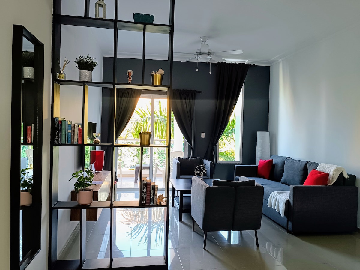 With an exquisite décor, this 2-bedroom apartment is equipped with everything you need for a perfect relax amid the Caribbean breeze, sun and beach. The main bedroom has a King size bed with private bathroom, and the second bedroom has two twin size beds with closet and external bathroom. Both rooms have their own air conditioning. NEW and fully equipped kitchen. SERVICES INCLUDED: - Fully equipped kitchen - Bathroom Amenities - Cable TV - One 5-gallon water bottle included