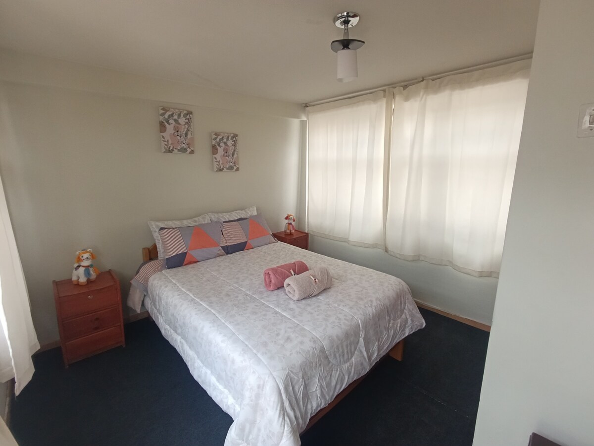 クスコの快適で広々としたアパートで、パノラマビューが楽しめます。最大6名様までご宿泊いただけます。テレビとヒーター(オプション)を備えた3ベッドルーム、フルバスルーム2室、リビングルーム、ダイニングエリア、設備の充実したキッチン、ランドリー、Wi-Fiを備えています。お湯は24時間365日ご利用いただけます。5階にあります(エレベーターなし)。駐車場あり。歴史地区からわずか数分で、クスコを快適に楽しむのに最適です。