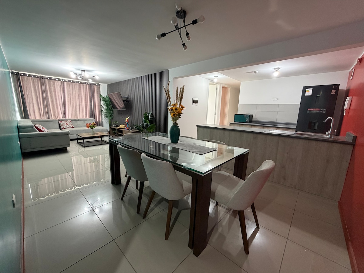 カハマルカの静かで安全なエリアにある3階に位置する居心地の良いアパートで、歴史地区の中心部に近く、独立した入り口、三角屋根、3つの寝室(2つの2人用ベッドと1つの1 ½人用ベッド)があります。ケーブルテレビ、Wi-Fi、設備の整ったキッチン、お湯が出るバスルーム、ランドリーエリアを備えたリビングルームがあります。専用ガレージ付き。メガプラザ、オープンプラザ、レアルプラザの近くにあります。快適で安全、そして立地の良い空間で、昼の暖かい気候と夜の新鮮な空気をお楽しみください。