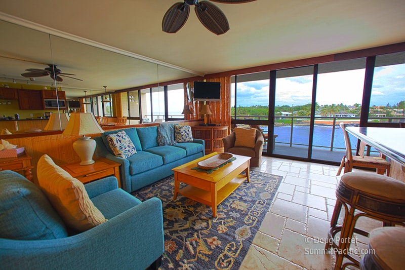 オーシャンフロントのコンドミニアム。ユニットの専用の屋根付きバルコニーラナイから、下を泳ぐウミガメを見ることができます。 ユニットはエアコン付きで、美しく装飾されています。 フルキッチンとオーシャンサイドのダイニングテーブルが備わっています。 薄型の壁掛けスマートテレビがあり、高速インターネット接続が可能です。 寝室から海のロマンチックな音に耳を傾け、毎朝美しい太平洋の日の出に目覚めましょう。 建物にはエレベーター2台、コインランドリー、無料駐車場があります。