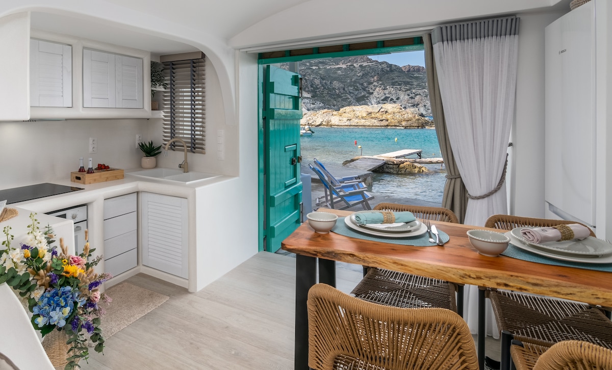 カラフルな土地「Syrma」は、部分的に洞窟のようなボートハウスで、2022年に完全に改装され、快適さ、リラクゼーション、西ミロスの丘の素晴らしい景色を提供します。 キクラデス建築の価値観と贅沢な雰囲気が融合したデザイン哲学です。 統一されたアーチ型のインテリアには、キッチン、リビングルーム、バスルームに接続された高さのあるキングサイズベッドがあります。 考古学的価値のある丘に囲まれ、海に面しています。