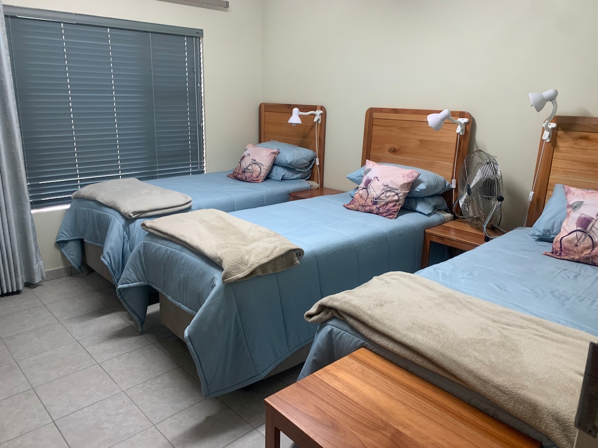 新しく改装されたフラットで、専用の玄関、無料の屋根付きの舗装された駐車場があります。最近ソーラーを設置しました。ボアホール水。子供とペットに優しい。プライベートなバーベキューエリア。2つのワークスペース。壁のプラグにUSB接続。無料Wi-Fi。Netflix搭載のテレビ。ヘアドライヤーとアイロン。クイーンサイズベッド。エアフライヤー、電子レンジ、トースター、ケトル、プランジャー、食器、カトラリーを備えた専用キッチン。バスタブ、シャワー、ツインバスタブ、ビデ、外の座席を備えた非常に広々としたバスルーム。