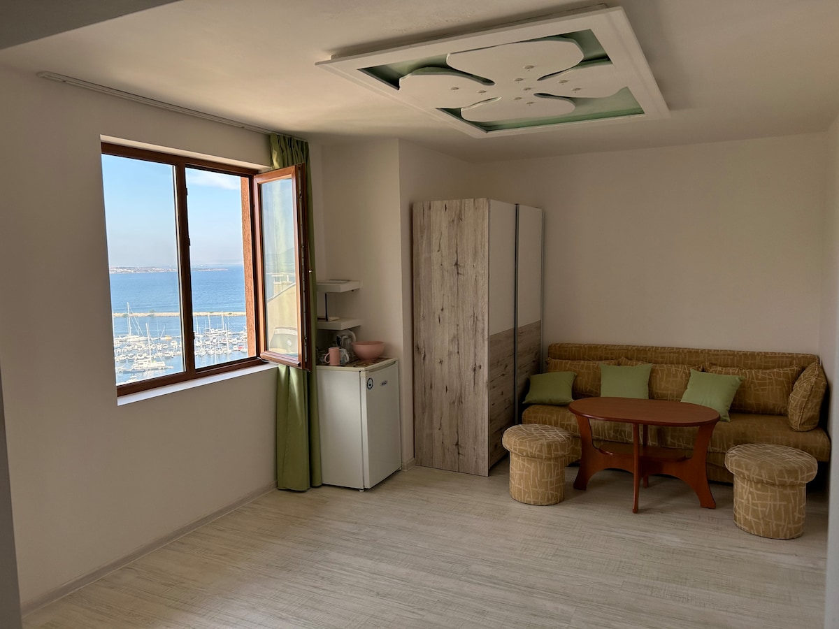ユニークな眺めのアパートは、中央のビーチからわずか150 mのソゾポルの新しい町の始まりにある小さな家族経営のホテルのパノラマフロアにあります。広々としており、内側からも外側からもヨットハーバー、海、ビーチまで美しい景色が楽しめます。 ユニークな眺めのアパートは4名様用です。