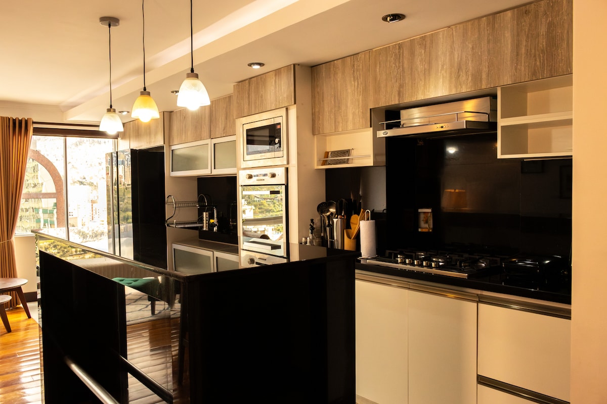 絶景を楽しめる超快適なダウンタウンペントハウス! ラパスの象徴的な建物の19階にある魅力的な2階建てのペントハウスに滞在しましょう。 息をのむような日の出と素晴らしい夜景をお楽しみください。 大使館、トップレストラン、パブ、スーパー、ショッピングセンターから徒歩圏内です。 「テレフェリコ」ケーブルライン駅まで徒歩5分など、便利な交通機関がすぐそこにあります。 快適で思い出に残る滞在に最適です!