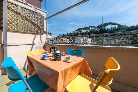 In the center of Rome a private penthouse open louvered window coverings in a living room to maximize light and reveal wraparound views of Central Rome and St peter's basilica. A period fireplace, terra cotta tiles create a traditional feel. Private terrace fully furnished. Two double bed rooms. Ten minutes walk from St Peter's square and Vatican Museums. Overlooking Rome and St Peter's. 2 minutes walk to public transportation, bus & metro will take you easily to all the main historical sites.