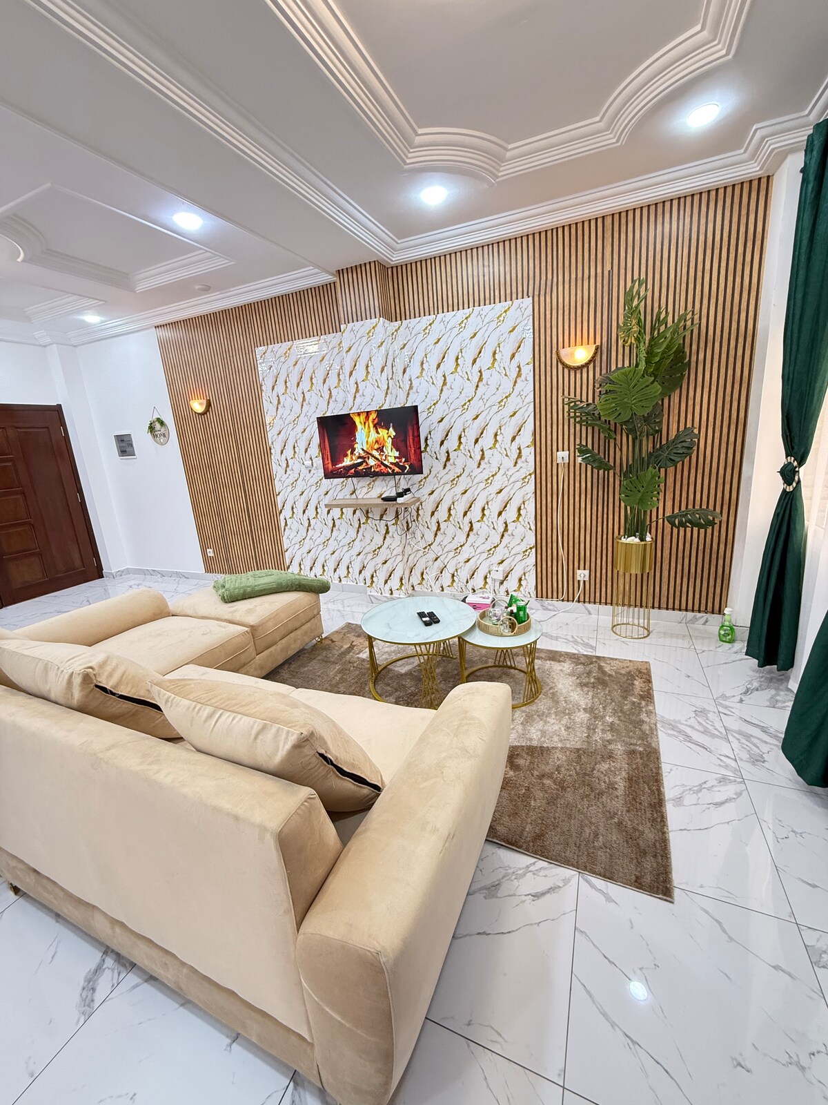 •家具完備の素晴らしいアパートで、2つの寝室、リビングルーム、ミニキッチンエリア、バスルーム、モダンなトイレがあります。 • NetflixとWi - Fi接続を備えた55インチの大きなQLED画面があります。 •昼夜を問わず警報システム、電気フェンス、CCTVカメラで保護された24時間365日対応の清掃サービス。 •停電時の電子発電機、水バッチ、専用駐車場。